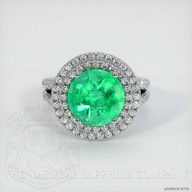 The ring features a beautiful, transparent 4.42 carat round shape green emerald with the dimensions of 11.29 x 11.22 x 7.21 mm and a mixed brilliant cut. It has a clarity grade of slightly included (evaluated at eye level), light color saturation, and an excellent polish. The origin of this emerald is Colombia.