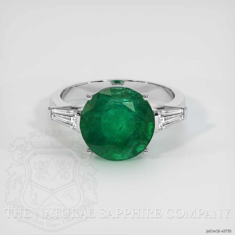 The ring features a beautiful, transparent 4.43 carat round shape green emerald with the dimensions of 10.54 x 10.38 x 7.11 mm and a mixed brilliant cut. It has a clarity grade of slightly included (evaluated at eye level), dark color saturation, and an excellent polish. The origin of this emerald is Zambia.
