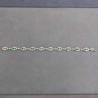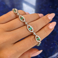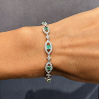 The exquisite bracelet features a harmonious fusion of precious gemstones and meticulous craftsmanship, embodying luxury and elegance. It is entirely set in 18K white gold, ensuring both durability and a sophisticated finish. The bracelet showcases multiple emeralds, each meticulously faceted to maximize light reflection and enhance their vivid green hue. The emeralds are calibrated to maintain uniformity in size and shape, providing a seamless flow across the design.The primary faceting style employed for the emeralds is the step cut, a choice that not only highlights the natural clarity of the stones but also accentuates their rich color. Each emerald is surrounded by a halo of brilliant-cut diamonds, which are individually set to enhance the geometric precision and overall sparkle of the bracelet. These brilliant-cut diamonds serve to heighten the contrast with the emeralds, adding depth and dimension to the piece.The craftsmanship techniques used in this bracelet are of the highest standard, with particular attention paid to the prong settings that secure each stone. The prongs are crafted to be both minimal and secure, ensuring that they do not detract from the beauty of the gemstones while providing essential stability. The linkages between each segment of the bracelet are designed for fluidity and comfort, allowing the piece to drape elegantly across the wrist.The 18K white gold setting not only offers a timeless backdrop for the gemstones but also complements a wide range of other jewelry pieces, making this bracelet a versatile addition to any collection. Its refined design pairs effortlessly with both contemporary and classic styles, enhancing the overall elegance of the wearer’s ensemble. Whether worn as a standalone statement piece or in conjunction with other fine jewelry, this bracelet exemplifies sophisticated artistry and opulent design.