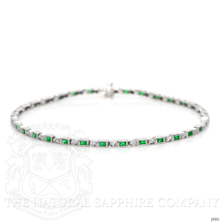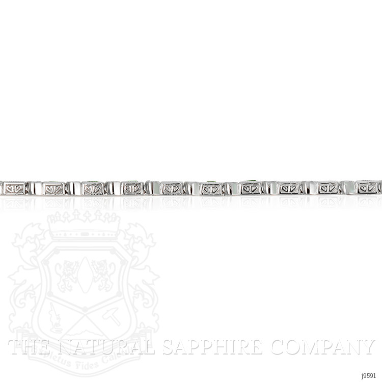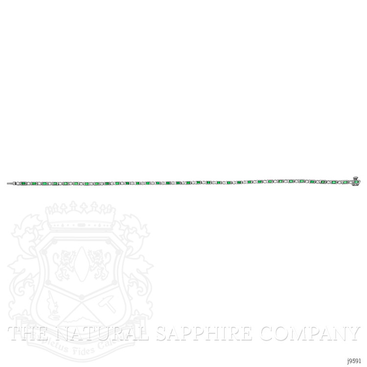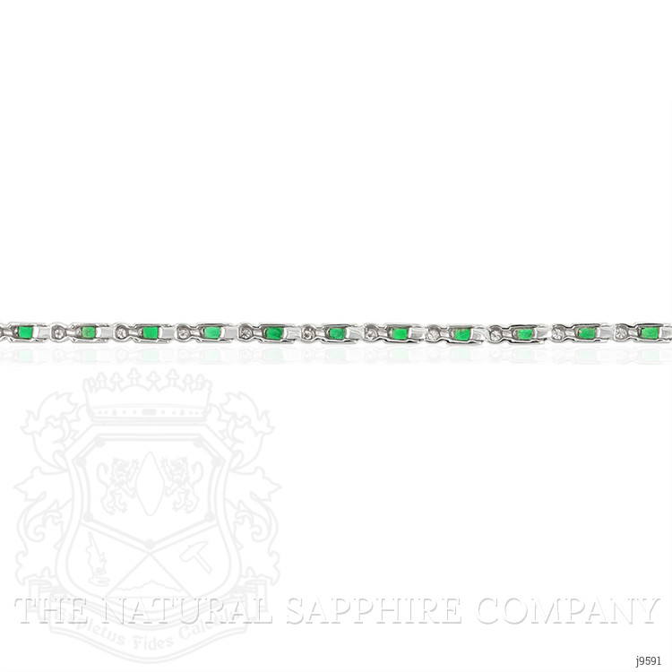 The following stones comprise the lovely bracelet and are entirely set in 18K white gold. The bracelet primarily features with 33 green emerald cut shaped step cut emeralds, weighing a total of 0.70 carats. The emeralds have a clarity grade of very slightly included, and color saturation of medium. The origin of these emeralds is Zambia.
