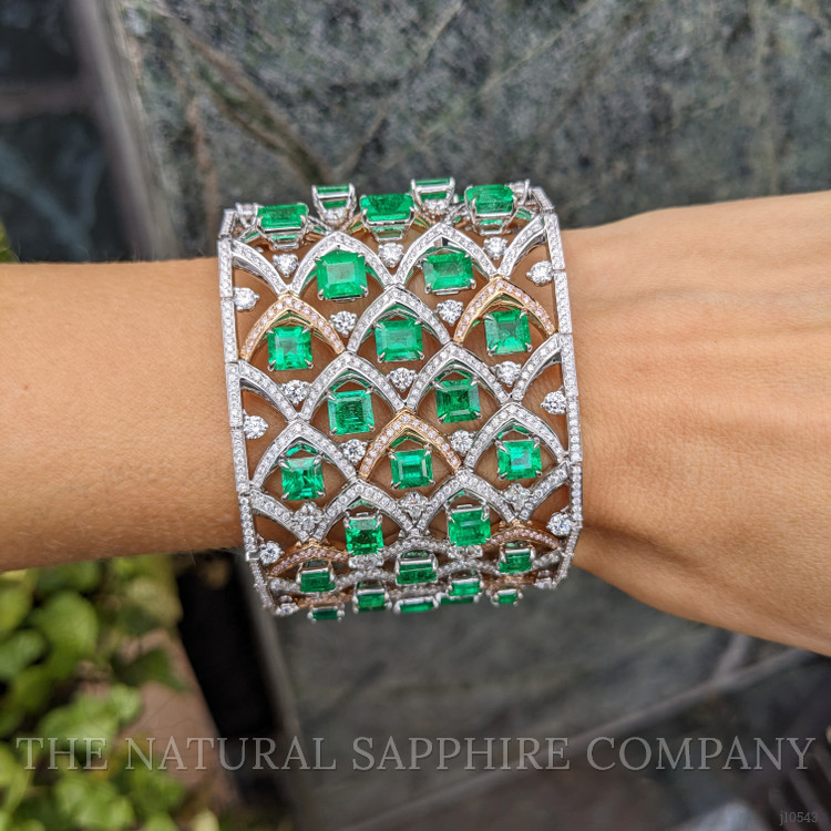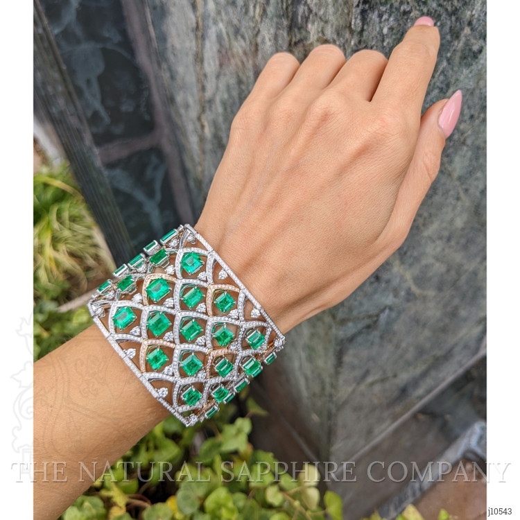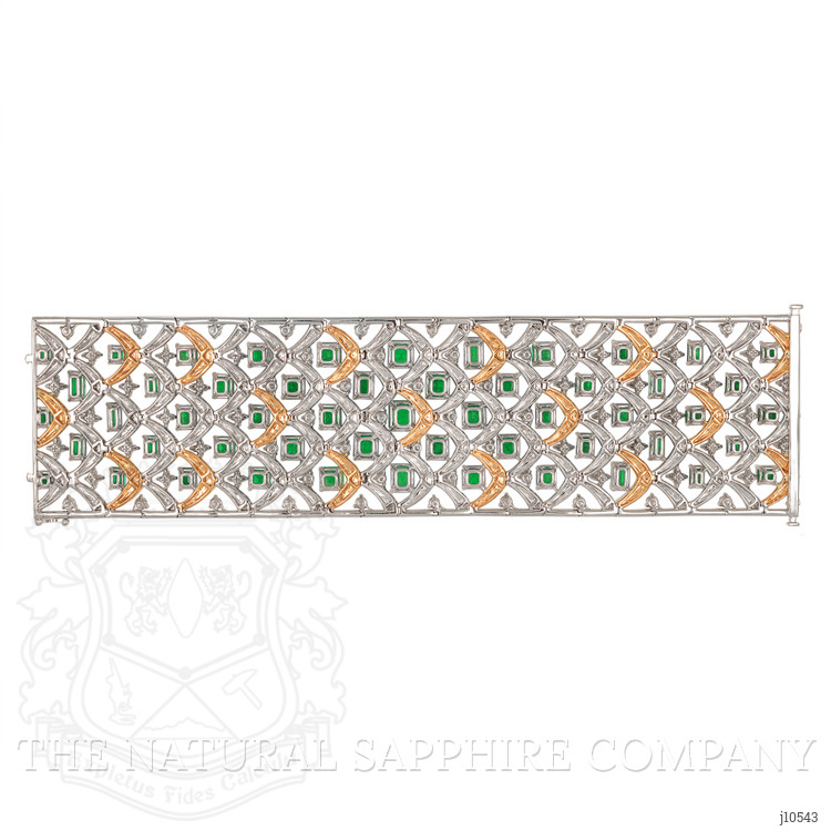 Imagine a moment when the world around you becomes more vibrant and your senses are heightened as you adorn your wrist with this exquisite bracelet. A masterpiece crafted from the finest 18K white gold and 18K rose gold, the bracelet serves not just as a piece of jewelry, but as an embodiment of elegance and sophistication. Each gemstone, selected for its unique beauty and radiant color, captures the essence of breathtaking allure.The vibrant green stones shimmer with an ethereal glow that dances with every movement, catching and reflecting light in a myriad of ways that create a visual symphony. From the warm glow of sunrise to the subtle hues of twilight, this bracelet transforms its sparkle under different lighting conditions, creating an emotional connection that transcends mere ornamentation. It becomes a part of your story, a testament to the moments filled with joy, love, and excitement.Imagine gifting this to someone special, the delight and wonder reflected in their eyes as they discover the intricate design and craftsmanship. It's not just a gift; it's a cherished memory waiting to be created. Whether it's a celebration of love, a milestone achievement, or a simple gesture of affection, this bracelet embodies the sentiment with grace and beauty. This is more than an accessory; it’s a timeless piece that transcends generations, imbued with the elegance of its craftsmanship, and the emotions it inspires.As you slip this piece onto your wrist, you will not only feel the luxury of exquisite metals against your skin, but also the deep emotional connection that it holds with each carefully set gemstone. It is an invitation to create everlasting memories, a celebration of beauty, and a symbol of the joy of giving. Let it be a beacon of light and love, illuminating your life and those you cherish most.