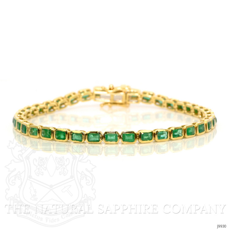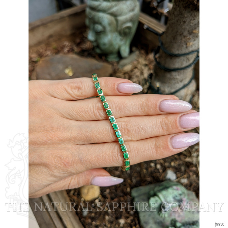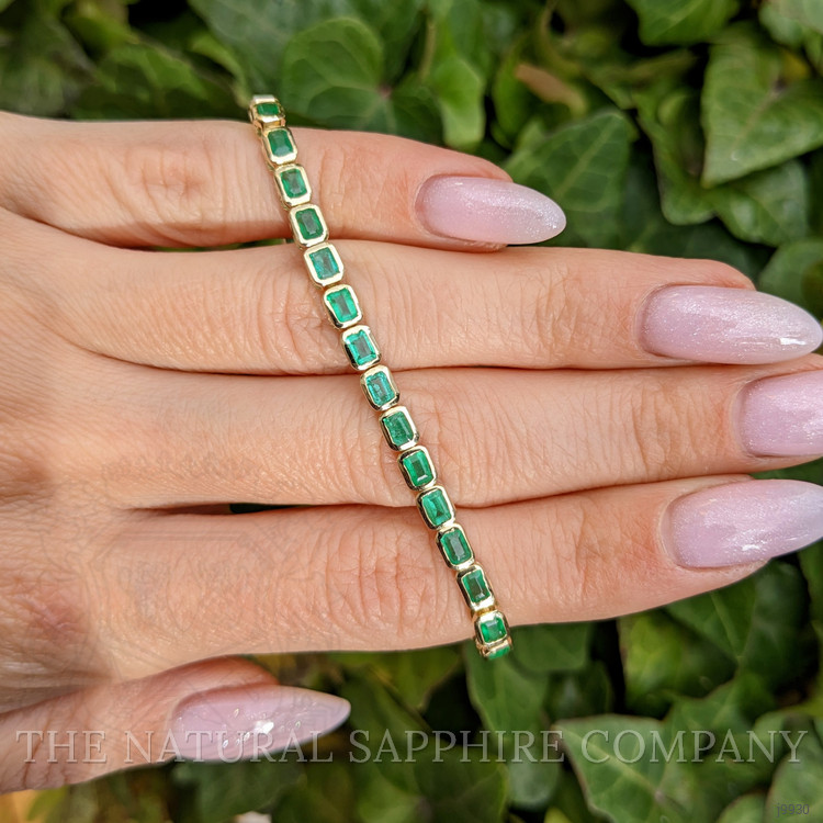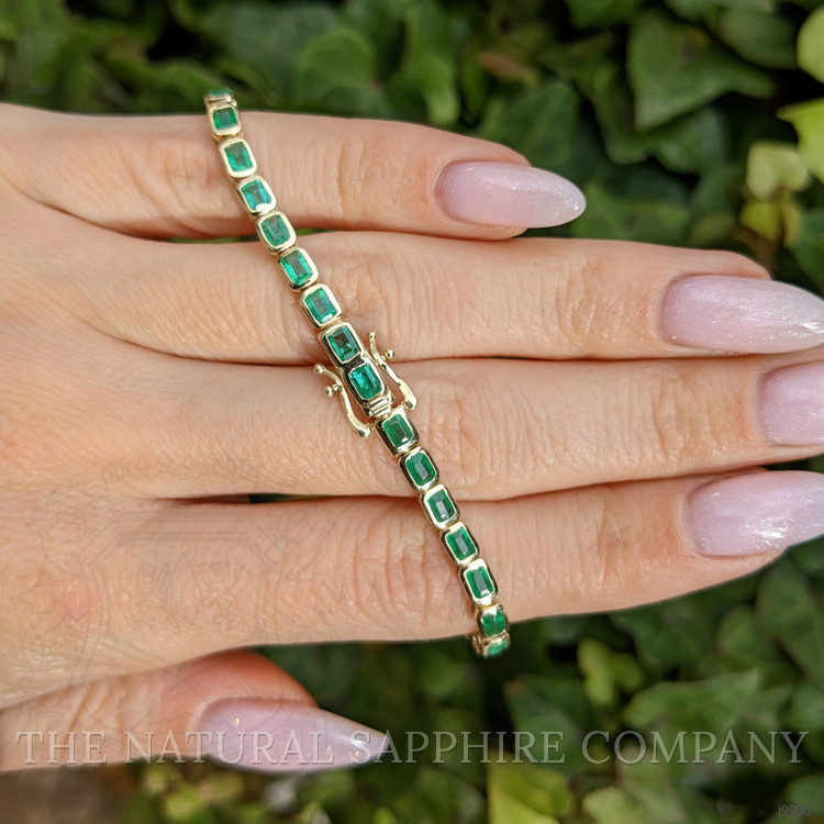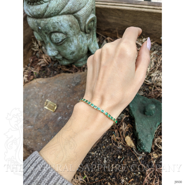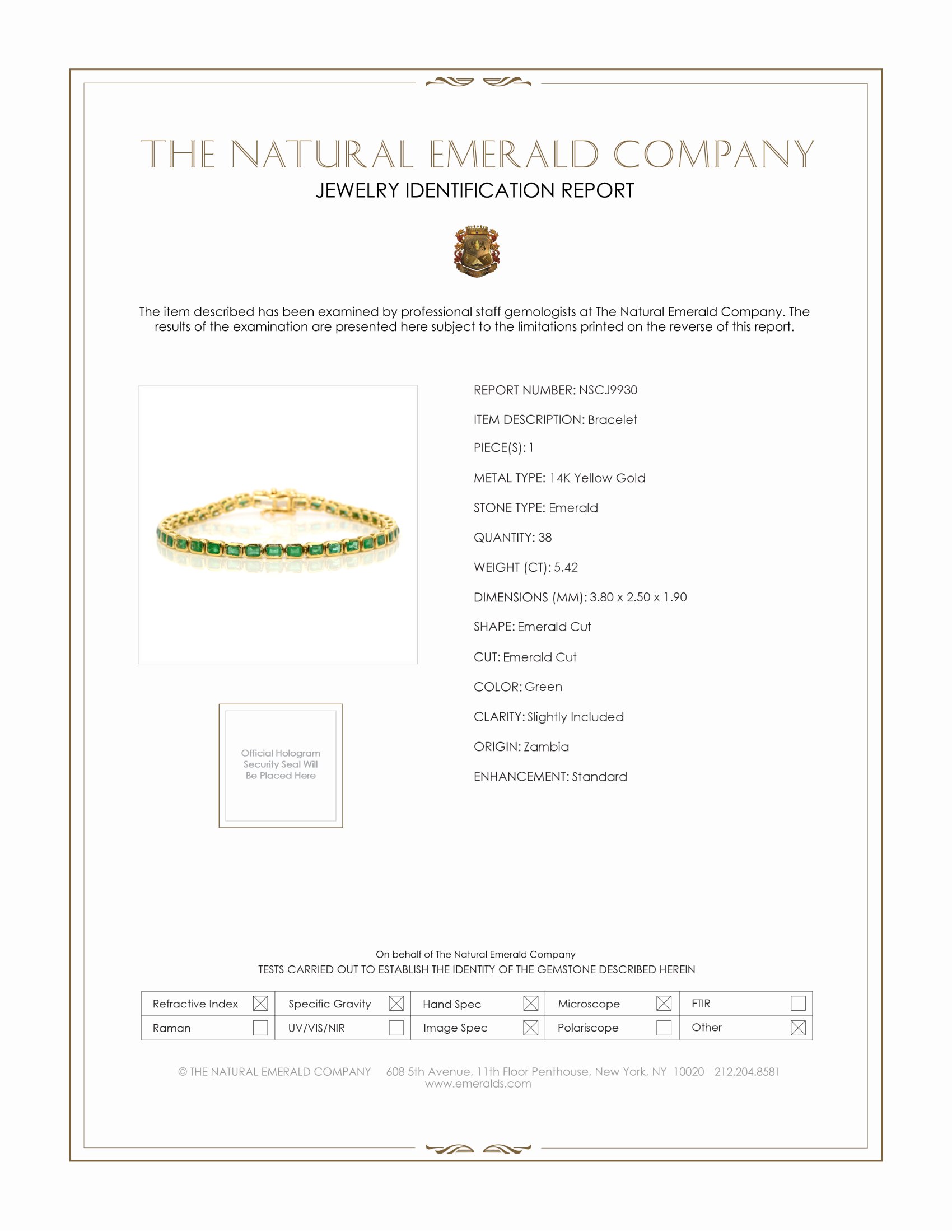Product Description for Emerald Bracelet in 14K Yellow Gold:Luxuriate in the lush allure of verdant beauty with this magnificent bracelet, exquisitely crafted from radiant 14K yellow gold. This striking piece showcases a breathtaking array of 38 resplendent emerald-cut Emeralds, their vibrant green hues reminiscent of the richest tapestry of nature. The total weight of these meticulously selected gemstones is an impressive 5.42 carats, making this bracelet not only a stunning accessory but a significant statement of elegance.Each Emerald, sourced from the renowned mines of Zambia, boasts a crystal-clear vision with a clarity grade of slightly included, ensuring that while they may carry nature's unique fingerprints, the overall appearance is incredibly striking. The medium color intensity of these precious stones reflects their pure and natural essence, presenting an enchanting spectrum of green that captivates the eye and soothes the soul.The bracelet's design allows the lustrous gold to enhance the deep, rich color of the Emeralds, with a secure setting that promises longevity and durability. Regarding dimensions, each emerald is expertly cut and fashioned to maximize its aesthetic appeal and create a harmonious flow around the wrist of the wearer.The classic emerald cut of the center stones not only honors the traditional gem-cutting heritage but also amplifies the Emeralds' clarity and depth of color, making them radiate with an inner fire that is both mesmerizing and timeless.Clarity, synonymous with genuine natural beauty, is tastefully displayed in these stones. Minor inclusions, often invisible to the naked eye, authenticate their natural origins and add character to each individual Emerald.The splendid coloration of these gemstones, a botanical green with enduring appeal, adds a touch of sophistication and vibrancy to any attire. It's a treasure that enhances not only personal style but also has the remarkable ability to elevate one's mood simply by being worn.This bracelet is more than a piece of jewelry; it's an emblem of refined taste and a love for the finest things in life. Its design style resonates with classic elegance, seamlessly blending with both contemporary and traditional outfits. With a secure clasp, this bracelet offers both peace of mind and comfort in fit.Opt for this bracelet in 14K yellow gold to indulge in the timeless grace of fine jewelry, making it the perfect gift for special occasions or a personal treat to celebrate life's milestones. For the discerning collector or the fashion-forward individual, the unique features of this bracelet will indeed fulfill the need for luxury, beauty, and a touch of nature's best.This extraordinary bracelet, set in the timeless metal of 14K yellow gold and adorned with Zambian Emeralds, is not just an accessory; it's an heirloom-in-waiting, ready to be cherished and adored for generations.