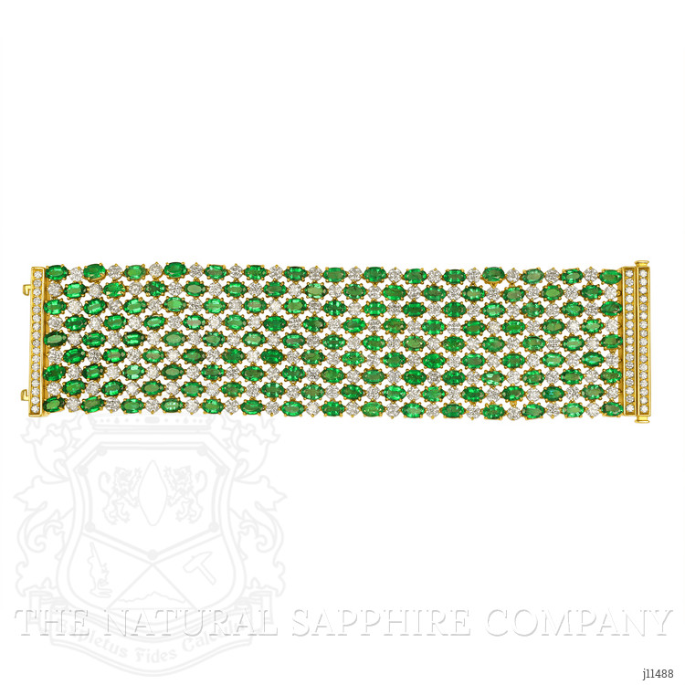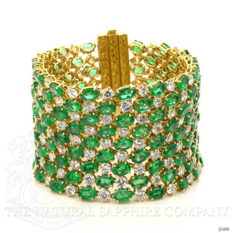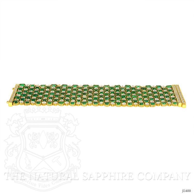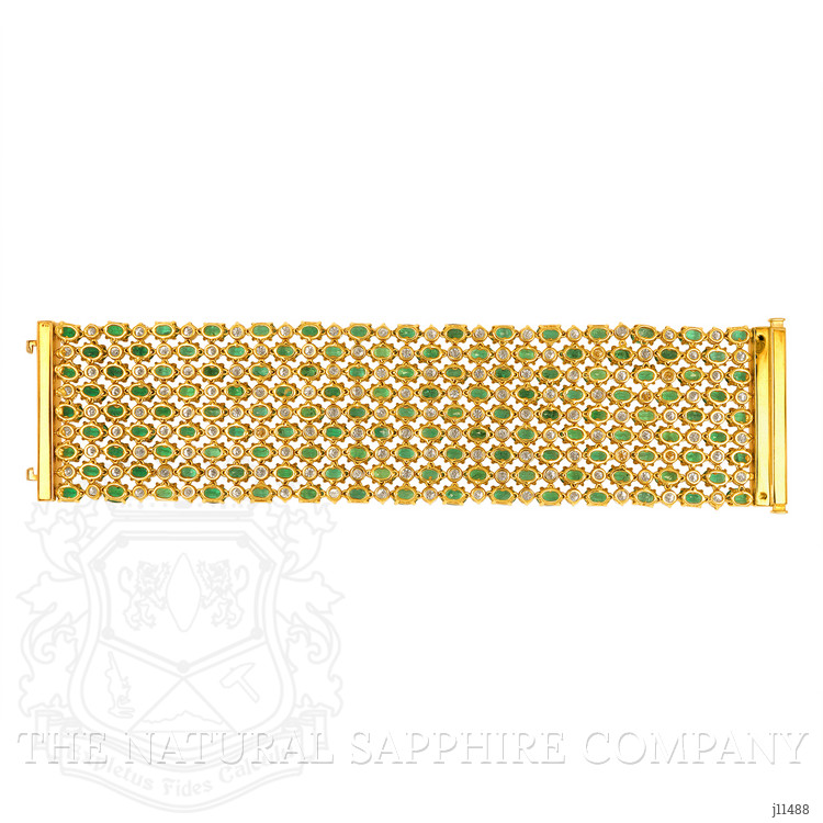 At the bench, master goldsmiths translate these natural narratives into technical excellence, the precision of the settings and the uniformity of the lattice echoing the meticulous standards associated with the finest houses of jewelry. The attention to detail rivals the tactile refinement you expect from storied names like Cartier, Van Cleef and Arpels, and Bulgari, where every prong, every connection, and every polished surface is considered for longevity and beauty. Our setters use refined techniques to secure each emerald and diamond with minimal metal and maximum visibility, so the stones sit low, safe, and luminous, and the clasp and hinge are engineered for effortless wear and enduring strength. The finish is hand polished to an even warm sheen, edges are rounded for comfort, and the rhythmic pattern of gems and gold creates a luxurious band that moves fluidly with the wrist. This bracelet is made to become an heirloom, a piece whose origin, craftsmanship, and subtle luxury invite stories to continue with each wearer, and to be treasured in the same confident way collectors admire the most respected names in fine jewelry.