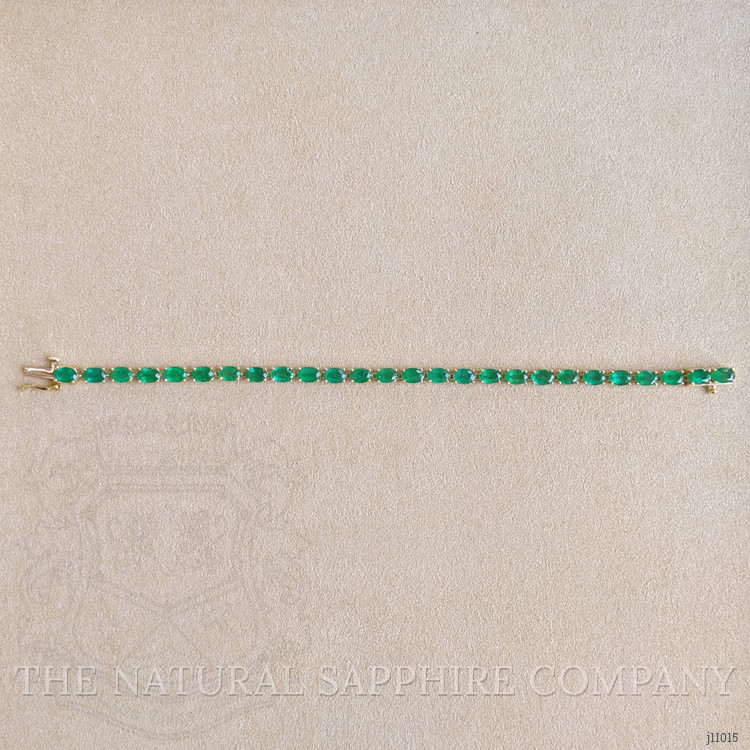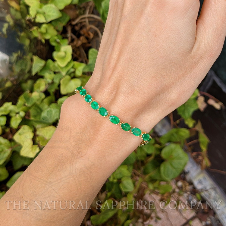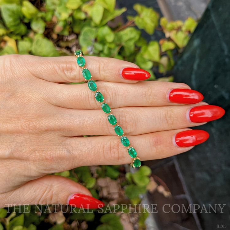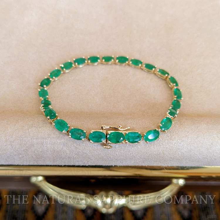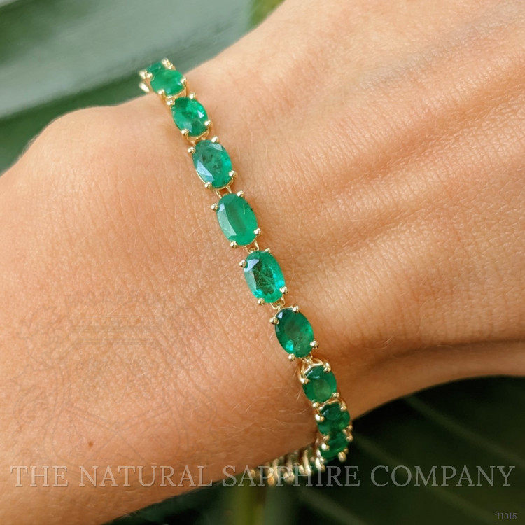 This exquisite bracelet, meticulously crafted in 14K yellow gold, features a captivating succession of vibrant emerald gemstones. Each stone is expertly cut, showcasing the time-honored oval cut known for maximizing light reflection to enhance their enchanting deep green hues. The faceting on the gemstones is crafted with precision to ensure that each stone captures and reflects light in all its grandeur, making every glance a dazzling experience. This bracelet is not merely an accessory but a symbol imbued with deeper meanings; love, success, and personal achievement, making it a poignant gift or personal treasure.