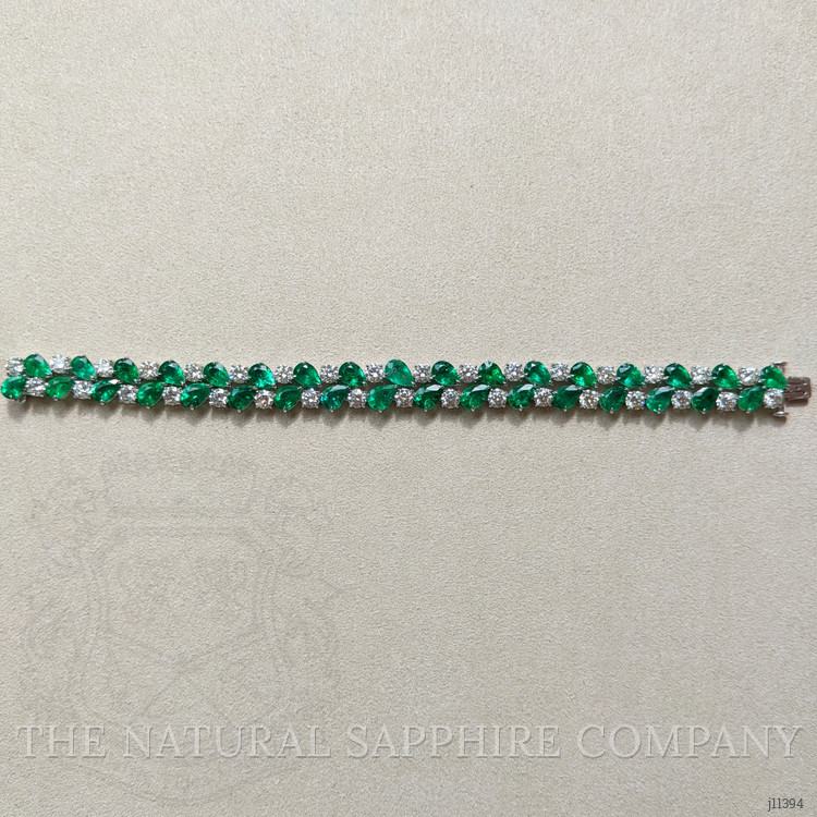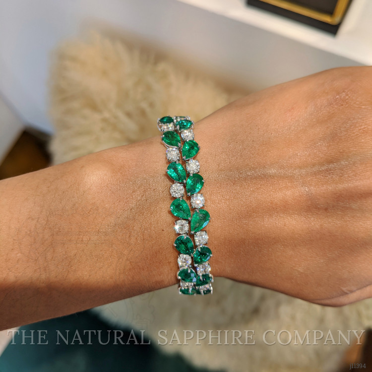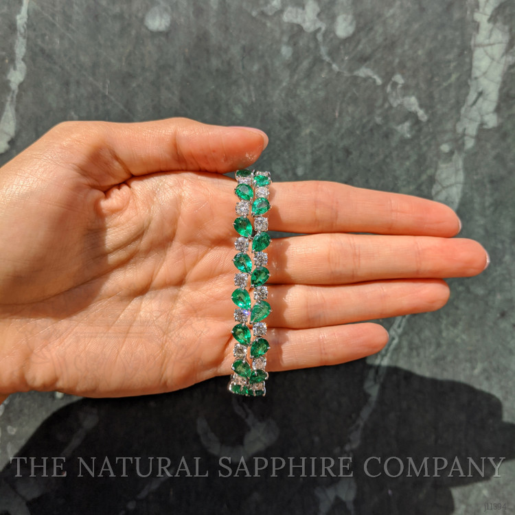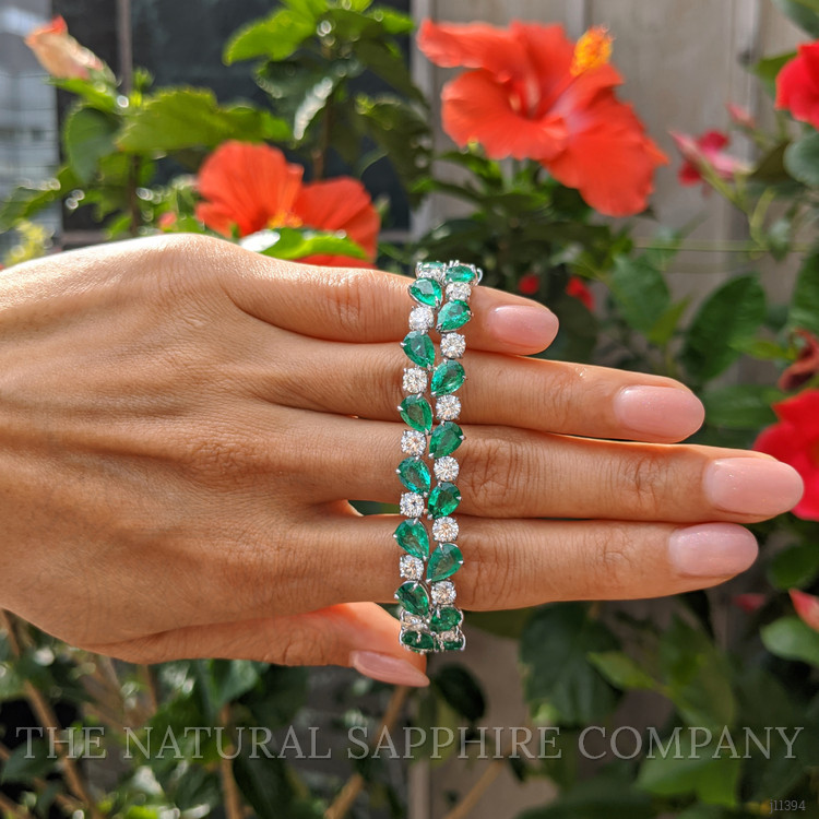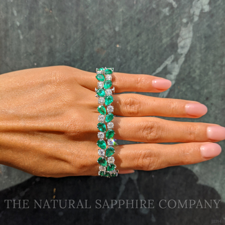 In the realm of fine jewelry, few pieces command the reverence of a meticulously crafted bracelet, where the art of nature meets human ingenuity. The platinum 950 setting of this exquisite bracelet, offered by The Natural Emerald Company, envelops a symphony of 34 green pear-shaped mixed brilliant cut emeralds and 34 white round brilliant cut natural diamonds. Each element comes together to narrate a story steeped in history, an homage to the timeless elegance that transcends eras and design trends.