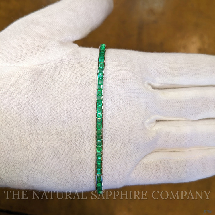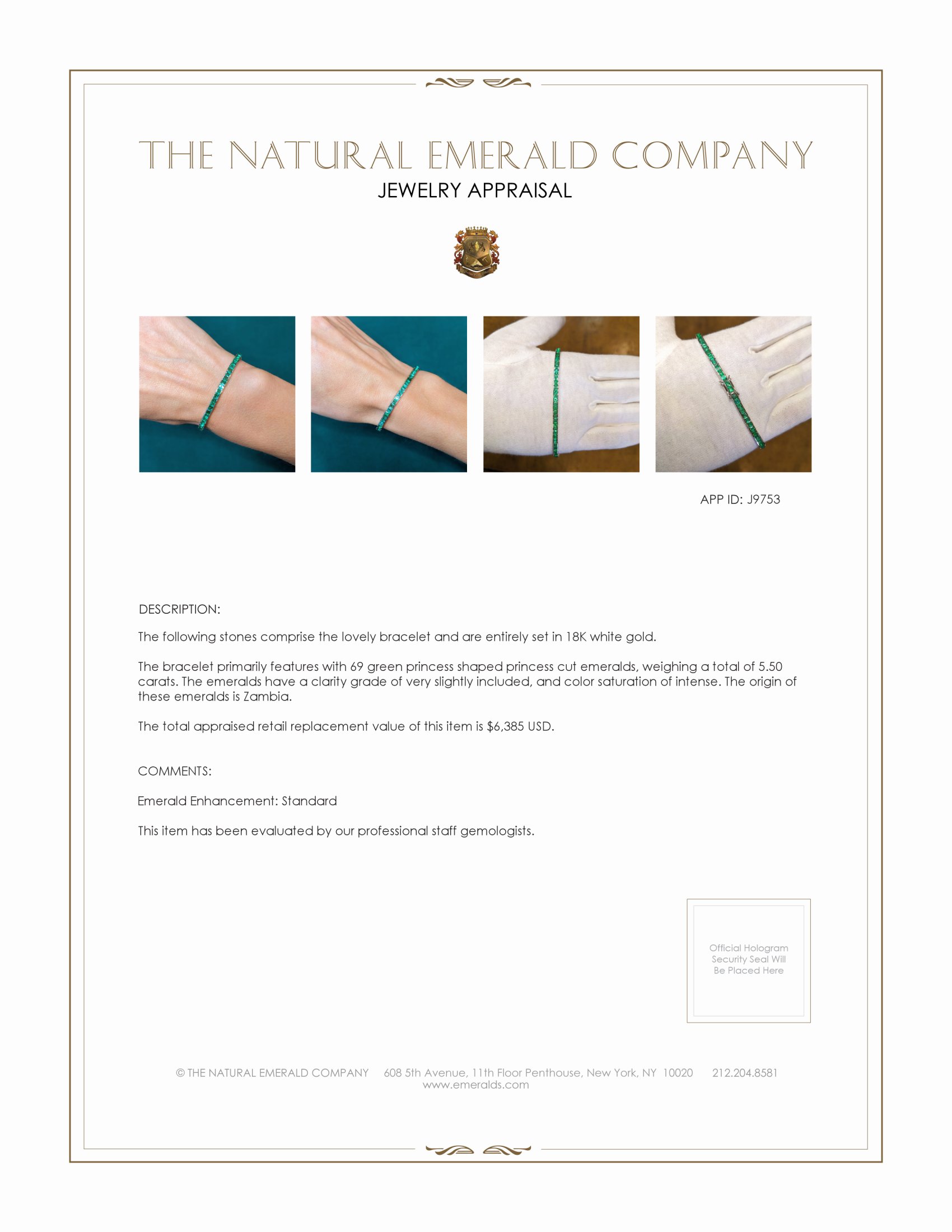 The centerpiece of the bracelet is a collection of 5.52 carats of emeralds, each carefully selected for their exceptional quality and vibrant color. These emeralds are expertly cut and polished to enhance their natural beauty, creating a captivating display of lustrous green tones that catch the light with every movement, spanning the 7" length of the bracelet.