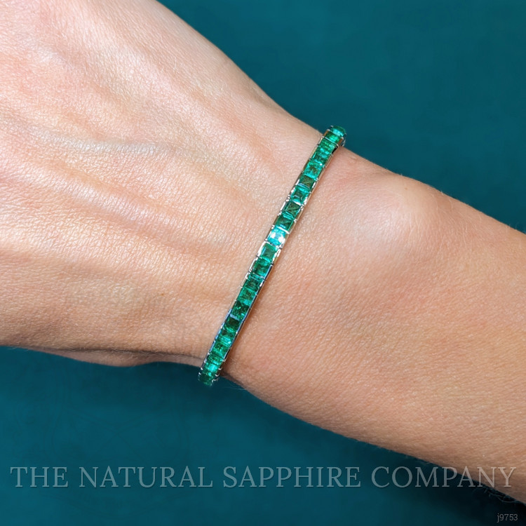 The design of the bracelet is both timeless and versatile, making it a perfect accessory for any occasion. The emeralds are arranged in a continuous line, gracefully encircling the wrist with a sense of fluidity and sophistication. The sleek and streamlined design allows the emeralds to take center stage, while also providing a comfortable fit.