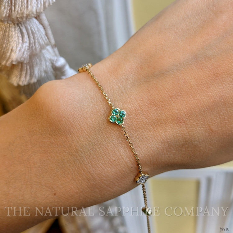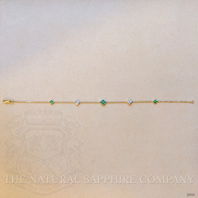 The following stones comprise the lovely bracelet and are entirely set in 14K yellow gold. The bracelet primarily features with 4 green round shaped mixed brilliant cut emeralds, weighing a total of 0.12 carats. The emeralds have a clarity grade of very slightly included, and color saturation of medium. The origin of these emeralds is Zambia. Featured in the bracelet are 8 white round shaped brilliant cut natural diamonds, weighing a total of 0.17 carats. The natural diamonds have a clarity grade of si2 - Slightly Included, H color, and color saturation of colorless. Also featured in the bracelet are 8 green round shaped mixed brilliant cut emeralds, weighing a total of 0.10 carats. The emeralds have a clarity grade of very slightly included, and color saturation of medium.