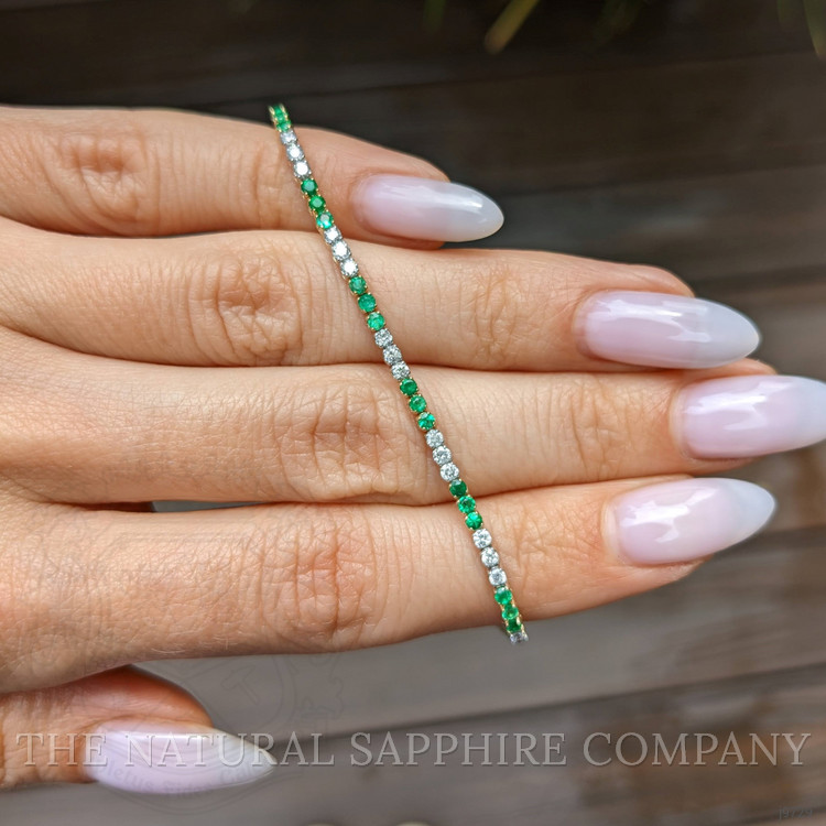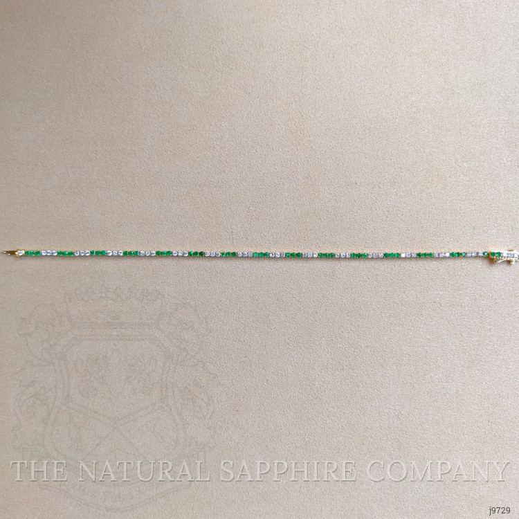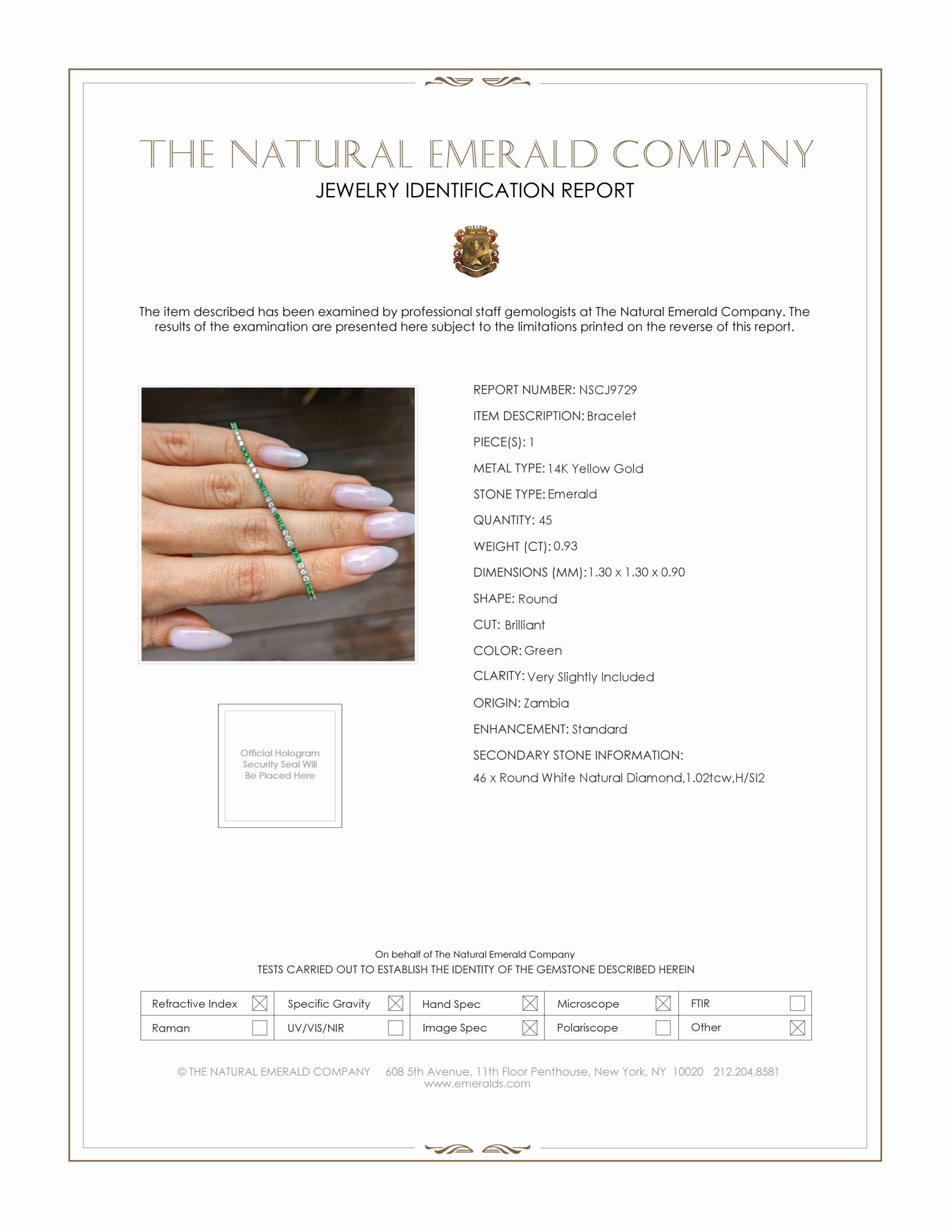 The following stones comprise the lovely bracelet and are entirely set in 14K yellow gold. The bracelet primarily features with 45 green round shaped brilliant cut emeralds, weighing a total of 0.93 carats. The emeralds have a clarity grade of very slightly included, and color saturation of vivid. The origin of these emeralds is Zambia. Also featured in the bracelet are 46 white round shaped brilliant cut natural diamonds, weighing a total of 1.02 carats. The natural diamonds have a clarity grade of si2 - Slightly Included, H color, and color saturation of h.