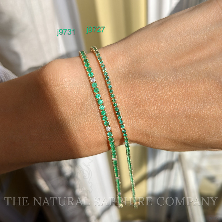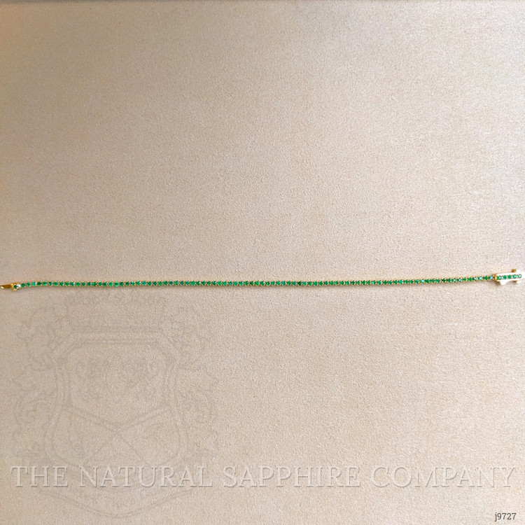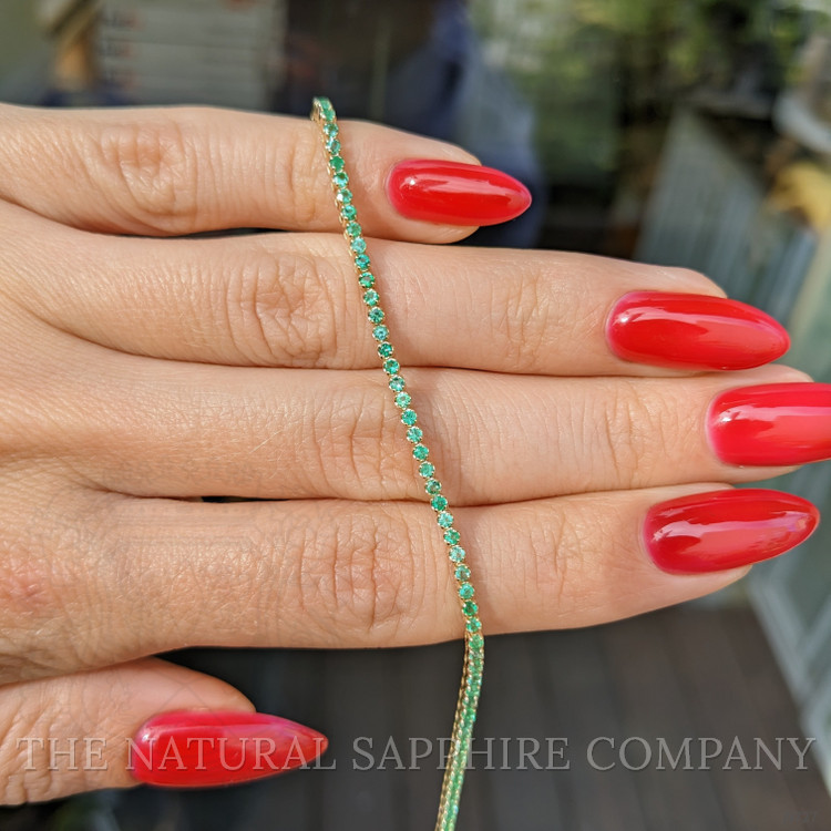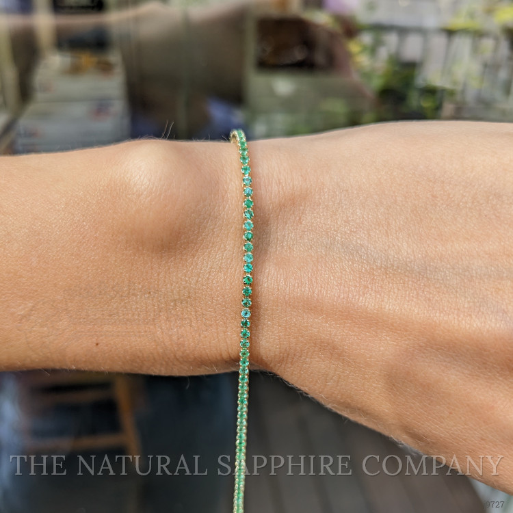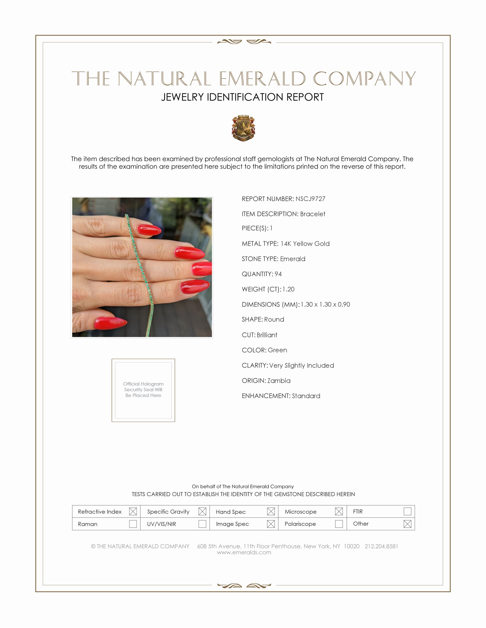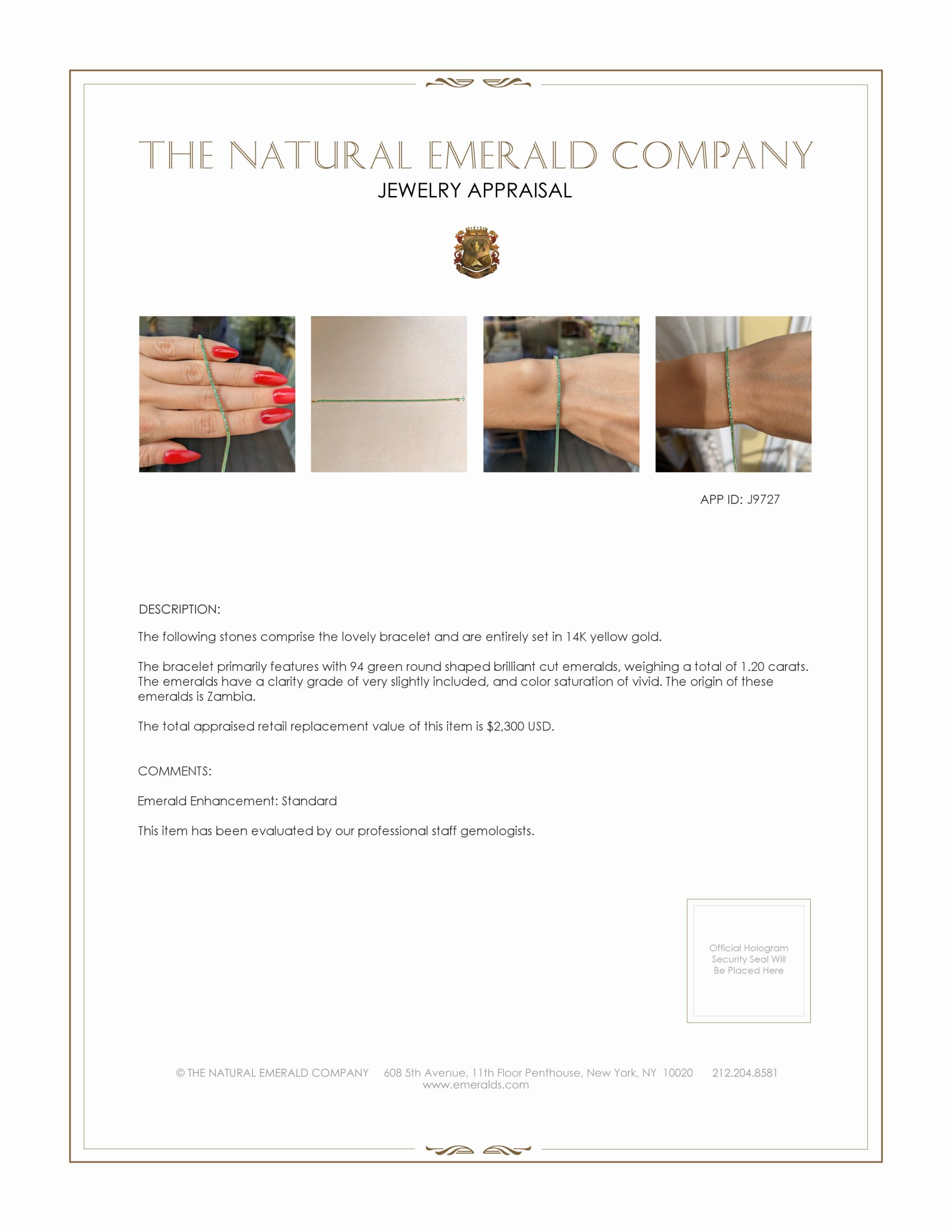 The following stones comprise the lovely bracelet and are entirely set in 14K yellow gold. The bracelet primarily features with 94 green round shaped brilliant cut emeralds, weighing a total of 1.20 carats. The emeralds have a clarity grade of very slightly included, and color saturation of vivid. The origin of these emeralds is Zambia.