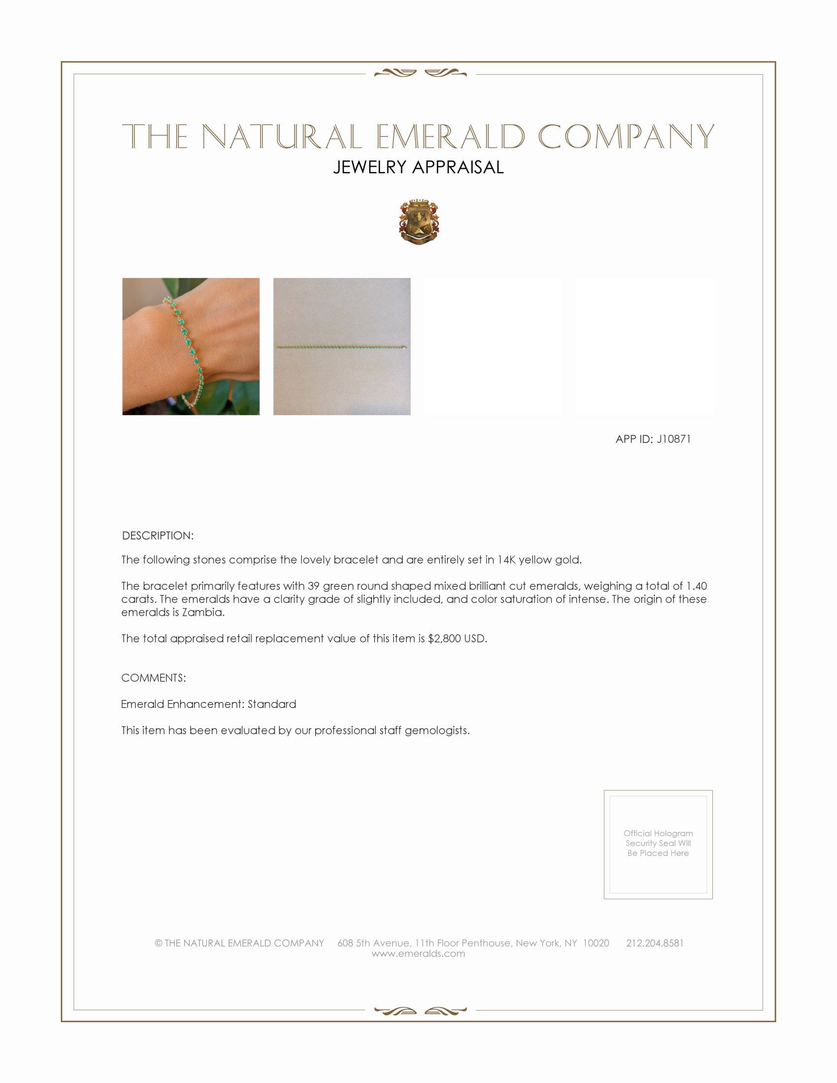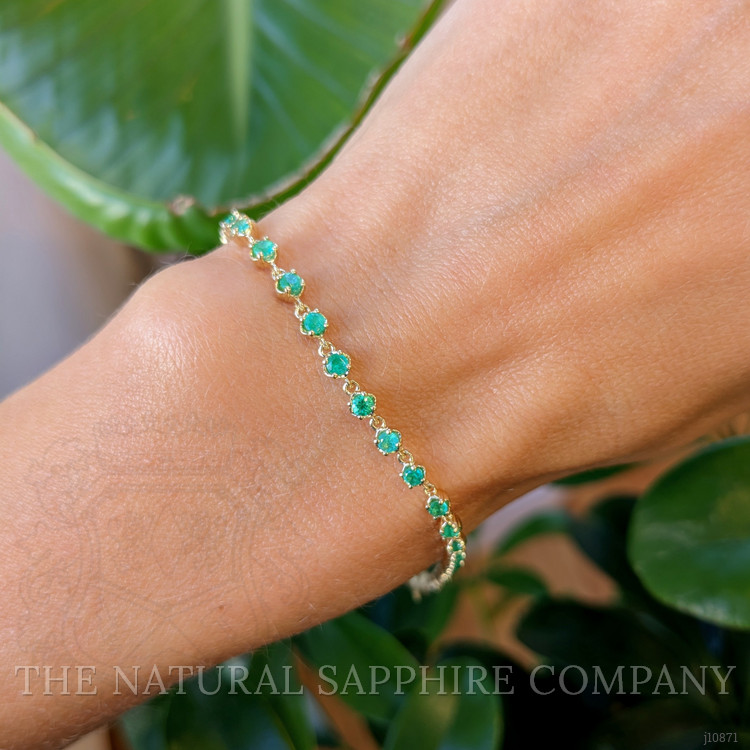 We are committed to sourcing both gemstones and metals responsibly, and this bracelet reflects that commitment. The emeralds are natural stones acquired through long standing relationships with suppliers who provide documented chain of custody and adhere to international best practices for fair labor and environmental stewardship. Our partners support local mining communities through transparent purchasing and investment in safety and rehabilitation initiatives, ensuring that the beauty of each stone is matched by respect for the people who bring it to light. The 14K yellow gold used in the setting comes from responsible sources, primarily recycled gold and refiners certified by recognized industry standards, and is processed to minimize environmental impact while maintaining the integrity and longevity that gold has symbolized for centuries. Every piece is finished by skilled artisans who apply traditional techniques alongside modern quality controls, and final inspections ensure that the bracelet meets rigorous standards for durability and finish. The result is a bracelet that feels both ancient and immediate, an object of lasting beauty that honors a legacy of craftsmanship and ethical care.