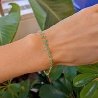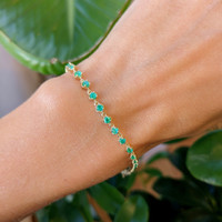 This delicate emerald bracelet recalls the long and romantic history of green gemstones, a lineage that stretches from antiquity to the workshops of today. Tiny, luminous emeralds form a continuous line of color that rests lightly against the skin, each stone held in a refined 14K yellow gold setting that enhances the depth and warmth of the green. The design is intentionally timeless, a modern interpretation of the classic tennis bracelet, meant to be worn daily or saved for moments that demand quiet elegance. Its proportions are modest and measured, inviting a lifetime of wear and the kind of sentimental layering that turns jewelry into heirlooms, carrying stories from one generation to the next.