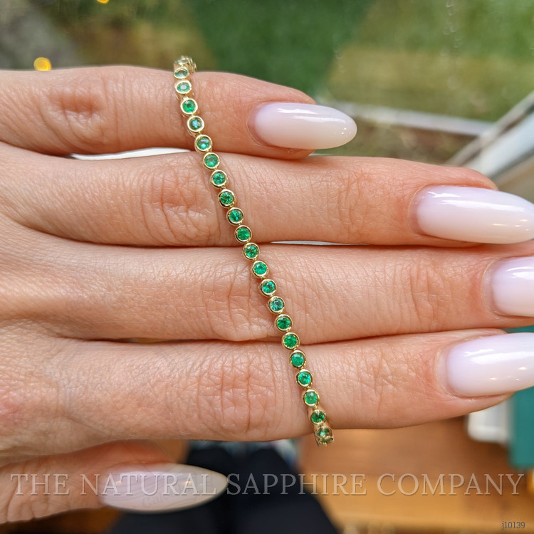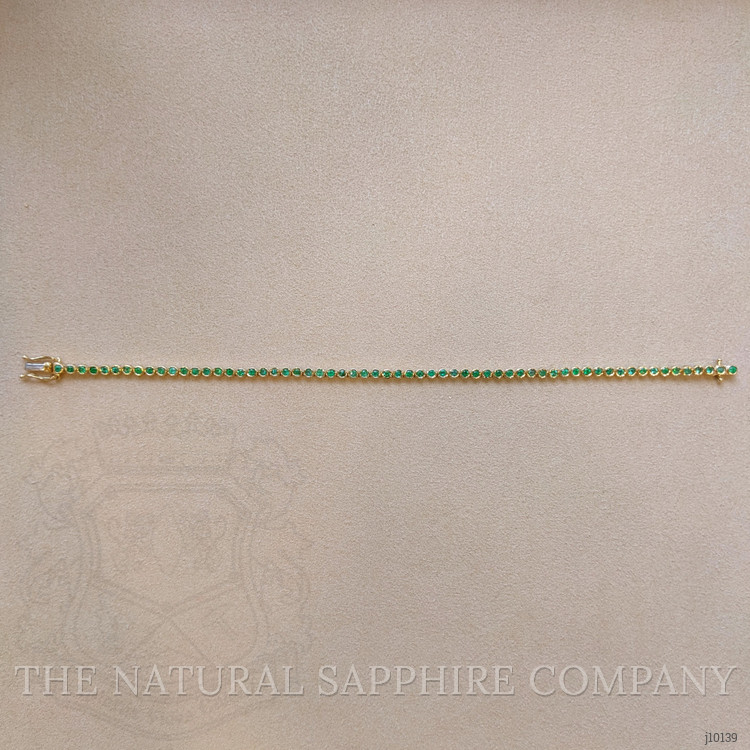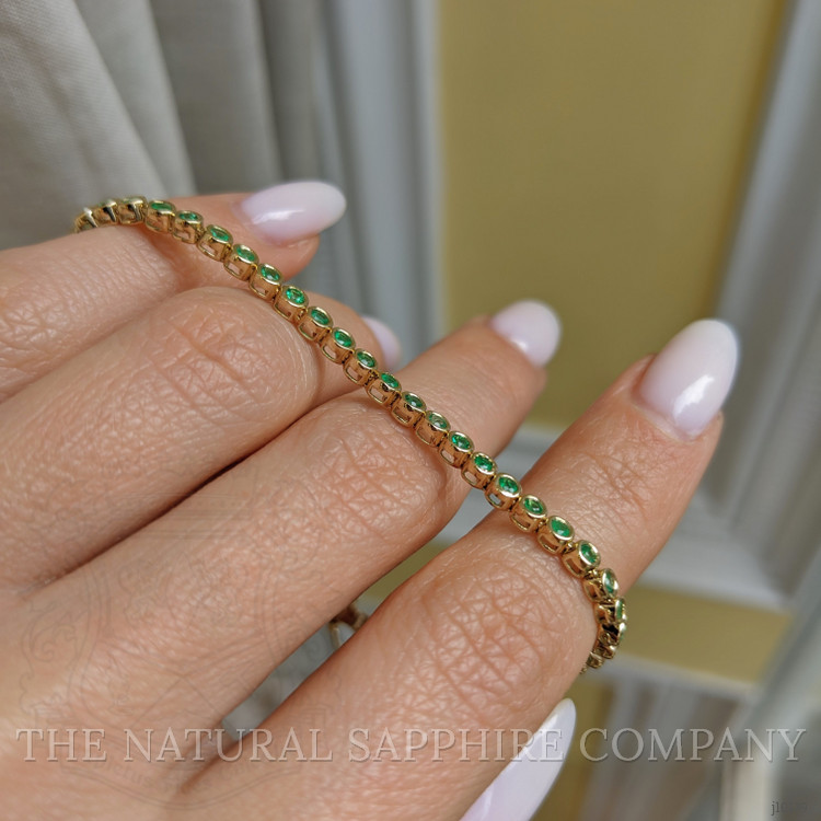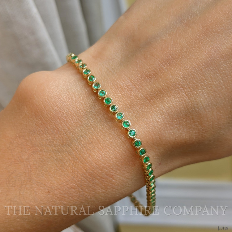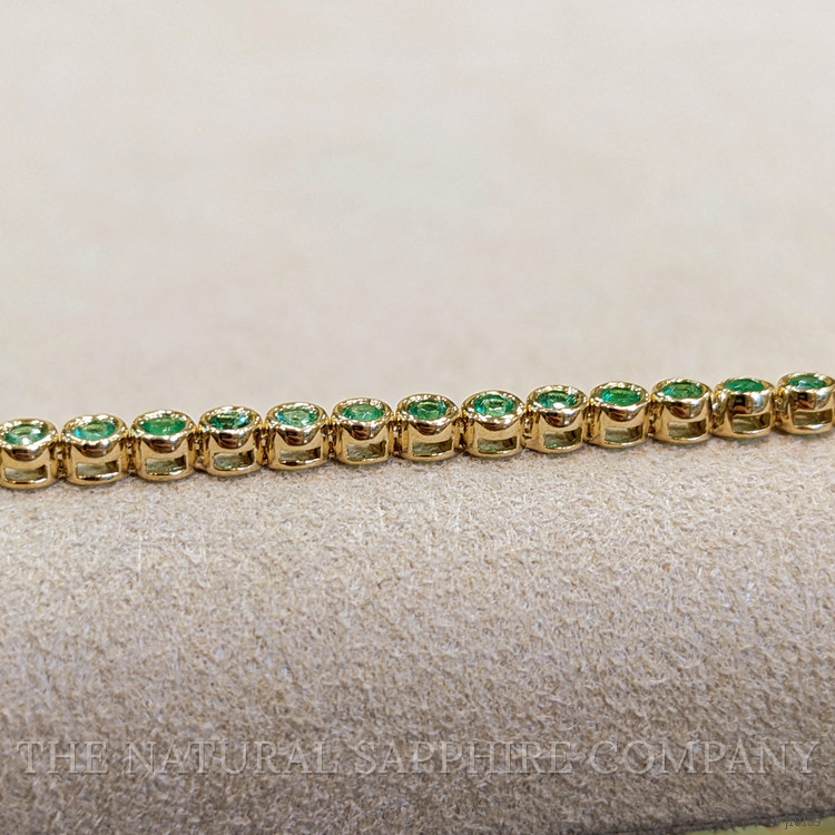 The following stones comprise the lovely bracelet and are entirely set in 14K yellow gold. The bracelet primarily features with 61 green round shaped mixed brilliant cut emeralds, weighing a total of 1.41 carats. The emeralds have a clarity grade of slightly included, and color saturation of intense. The origin of these emeralds is Zambia.