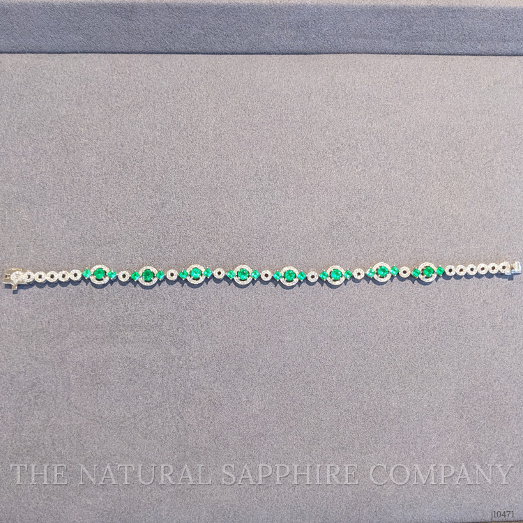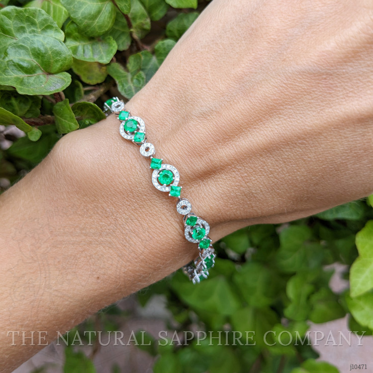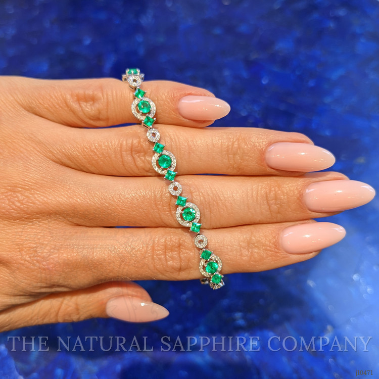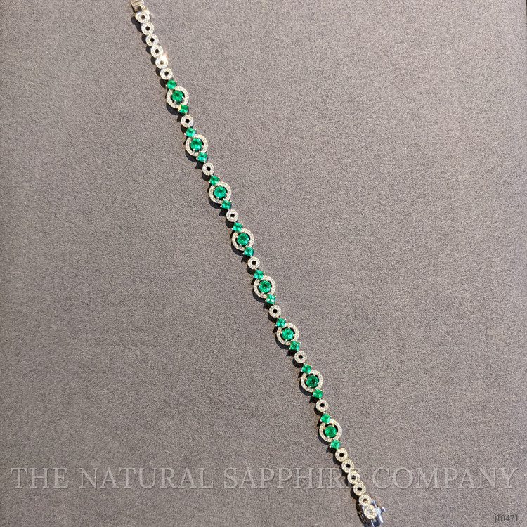 The gemstone bracelet featured is a masterpiece set in luxurious 18K white gold. This exquisite jewelry piece showcases the timeless elegance and rich history of the gemstones incorporated into its design. Crafted meticulously, the bracelet embodies classic and traditional elements that any connoisseur of fine jewelry will appreciate. The origins of these gems date back centuries, symbolizing timeless beauty and a connection to the earth's ancient treasures.Emerald gems, known for their legendary allure and mesmerizing green hues, comprise a significant part of this stunning bracelet. Each emerald is carefully chosen for its brilliant color and superior quality, paying homage to the gemstone's storied past. The emerald has always been prized for its rarity and vibrant appearance and this bracelet captures that legacy perfectly.White diamonds are also featured, accentuating the deep green of the emeralds. These diamonds, with their shimmering clarity and pristine brilliance, add a touch of sophistication and opulence. When combined with the emeralds, they create a harmonious blend of elegance and grandeur. The diamonds' sparkle contrasts beautifully with the emeralds, making the bracelet a mesmerizing spectacle.Comfort and flexibility are paramount in the design of this bracelet. Each gemstone is precisely set for maximum comfort and wearability, ensuring that the bracelet feels as luxurious as it looks. The 18K white gold setting is crafted to be fluid and adaptable, allowing for a perfect fit around the wrist. This blend of flexibility and durability means that the bracelet is not only stunning to look at but also exceptionally comfortable to wear every day.This bracelet is not just a piece of jewelry, it is a legacy, a statement of timeless beauty, and a treasure to be cherished. Its intricate design and historical significance make it a must-have for those who value tradition, elegance, and craftsmanship. Each wear brings with it the weight of history and the promise of enduring style, making this bracelet a perfect addition to any jewelry collection.