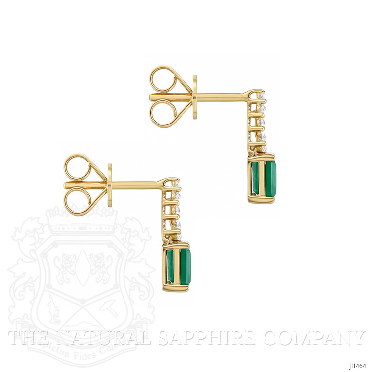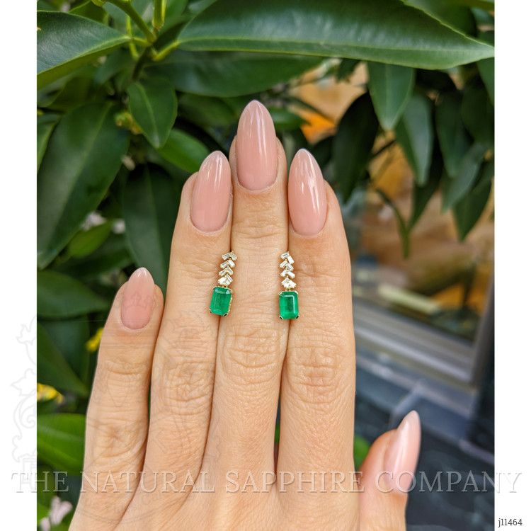From the cool, mineral rich veins deep within the earth, a block of green crystal was coaxed into the world by patient hands and geological time, carrying within it a hue that has whispered stories of rainforests, ancient crowns, and renewal. Each emerald cut stone in these earrings began its life as that raw promise, sleeping beneath layers of rock until careful miners guided its extraction so that every layer of color and clarity could be preserved. The stone then traveled to skilled cutters who understood how to reveal a stone that lives on the line between fire and transparency, who gave each emerald its signature step cut to concentrate the green, and to release a steady glow that seems to breathe with movement. The white baguette stones that crown the drop were chosen to mirror the emeralds in proportion and light, each one hand selected to create a gentle arrow of brilliance that points down to the focal gem. The setting for these luminous treasures is entirely 14K yellow gold, a metal chosen for its warm embrace, and for the way it deepens the green of the emerald and the cool flash of the white baguettes. The journey of these materials is a chain of human care and natural wonder, a passage from seam to studio, from rough to polished, that results in a piece of jewelry that feels inevitable when seen, as if the design had been waiting inside the stones all along.