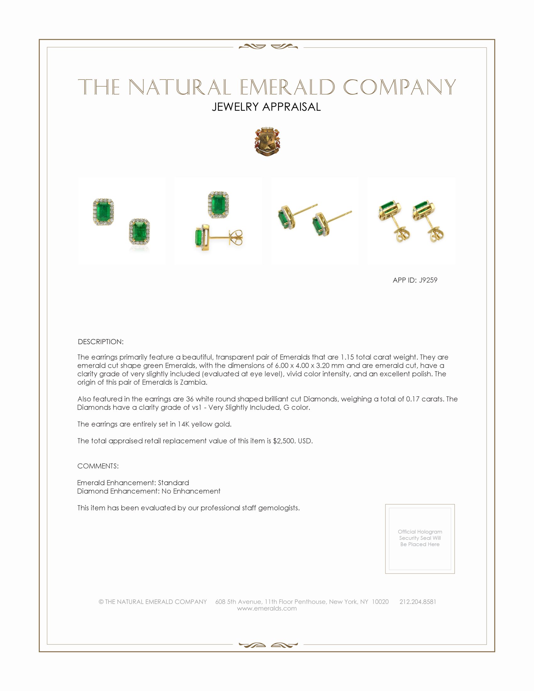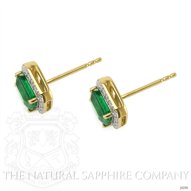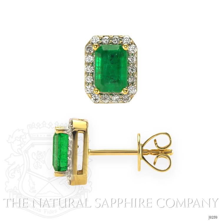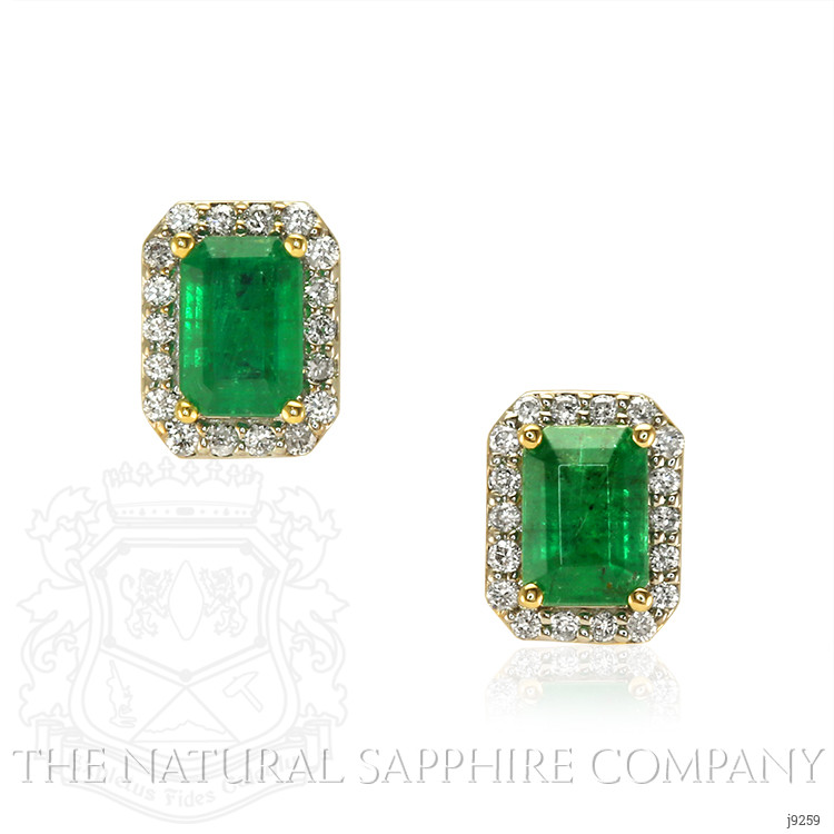 The earrings primarily feature a beautiful, transparent pair of emeralds that are 1.15 total carat weight. They are emerald cut shape green emeralds, with the dimensions of 6.00 x 4.00 x 3.20 mm and are emerald cut, have a clarity grade of very slightly included (evaluated at eye level), vivid color intensity, and an excellent polish. The origin of this pair of emeralds is Zambia. Also featured in the earrings are 36 white round shaped brilliant cut natural diamonds, weighing a total of 0.17 carats. The natural diamonds have a clarity grade of vs1 - Very Slightly Included, G color, and color saturation of g. The earrings are entirely set in 14K yellow gold.