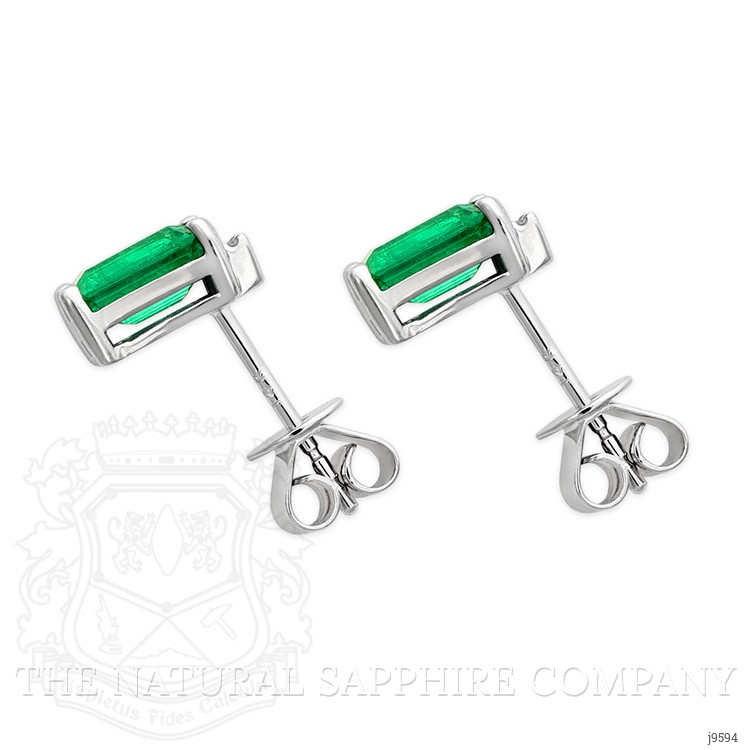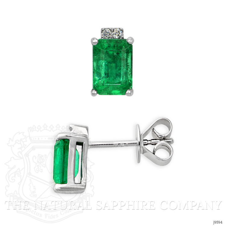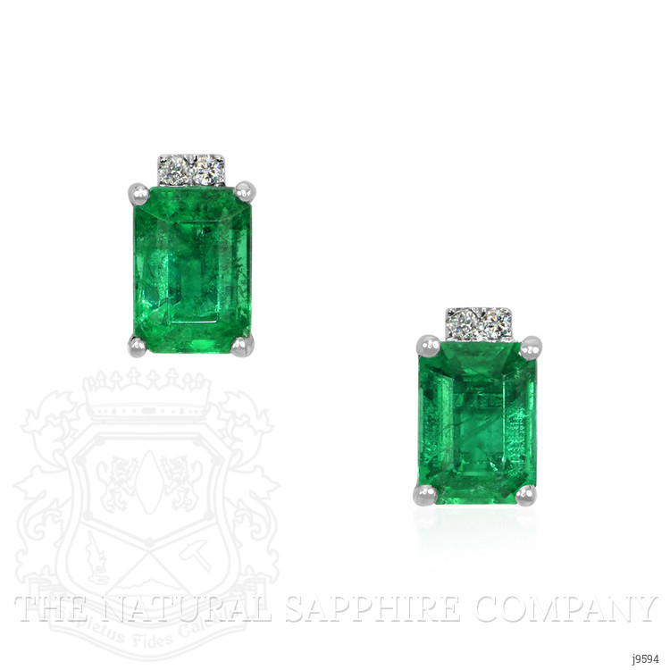 The earrings primarily feature a beautiful, transparent pair of emeralds that are 2.06 total carat weight. They are emerald cut shape green emeralds, with the dimensions of 7.09 x 4.52 x 4.79 mm and are step cut, have a clarity grade of very slightly included (evaluated at eye level), intense color intensity, and an excellent polish. The origin of this pair of emeralds is Zambia. Also featured in the earrings are 4 white round shaped mixed brilliant cut natural diamonds, weighing a total of 0.03 carats. The natural diamonds have a clarity grade of vs1 - Very Slightly Included., F color The earrings are entirely set in 14K white gold.