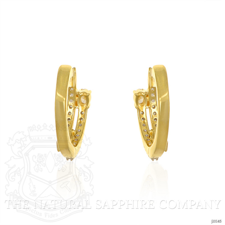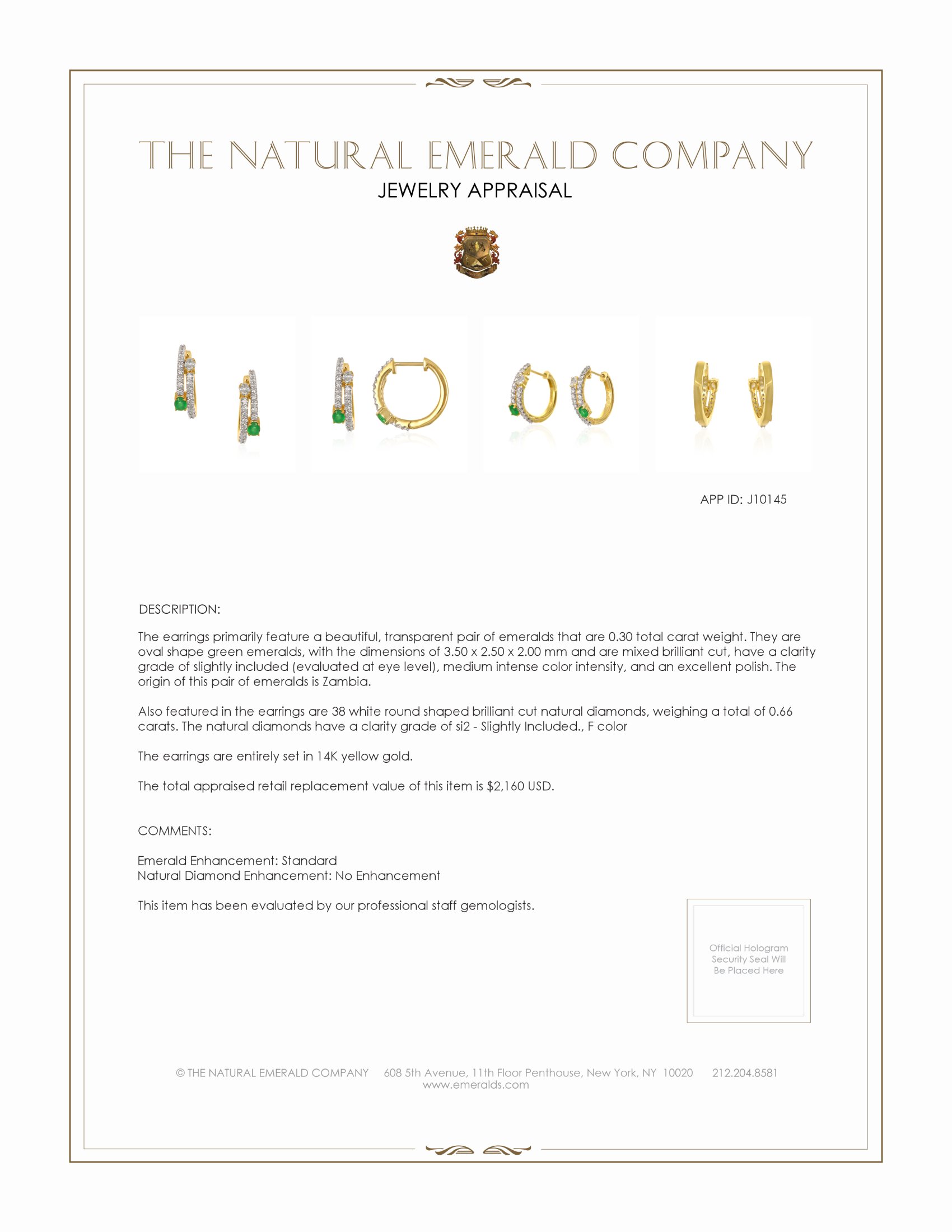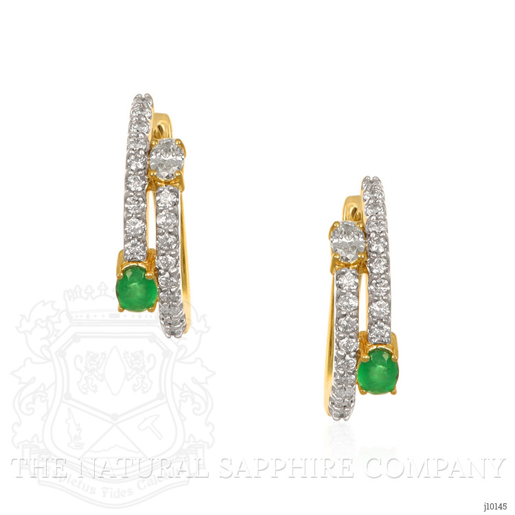 The earrings primarily feature a beautiful, transparent pair of emeralds that are 0.30 total carat weight. They are oval shape green emeralds, with the dimensions of 3.50 x 2.50 x 2.00 mm and are mixed brilliant cut, have a clarity grade of slightly included (evaluated at eye level), medium intense color intensity, and an excellent polish. The origin of this pair of emeralds is Zambia. Also featured in the earrings are 38 white round shaped brilliant cut natural diamonds, weighing a total of 0.66 carats. The natural diamonds have a clarity grade of si2 - Slightly Included., F color The earrings are entirely set in 14K yellow gold.