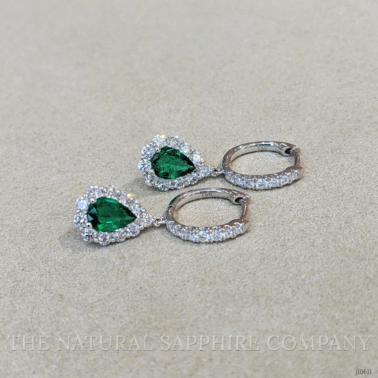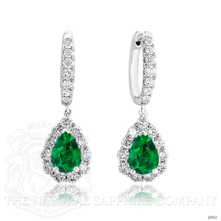 The earrings are elegantly crafted in 18K white gold, showcasing a balance of sophistication and modern design. The focal point of these earrings are the pear-shaped emerald gemstones, known for their vibrant green hue and rich heritage. Emeralds are cherished for their deep color and clarity, making them highly sought after in fine jewelry. These gemstones are carefully selected for their uniform color, ensuring a harmonious appearance that radiates luxury.Encircling the emeralds are meticulously arranged brilliant-cut diamonds. Known for their exceptional sparkle and fire, these diamonds enhance the overall brilliance of the earrings. The juxtaposition of the green emeralds against the white of both the diamonds and the gold creates a striking visual contrast that is both timeless and contemporary.Furthermore, each component of these earrings is crafted to the highest standards, emphasizing durability and elegance. The 18K white gold setting not only complements the gemstones aesthetically but also provides a robust frame, ensuring longevity. These earrings exemplify meticulous craftsmanship and the refined selection of materials, making them a distinguished addition to any jewelry collection.