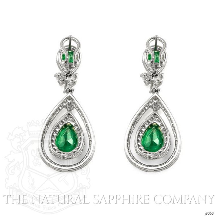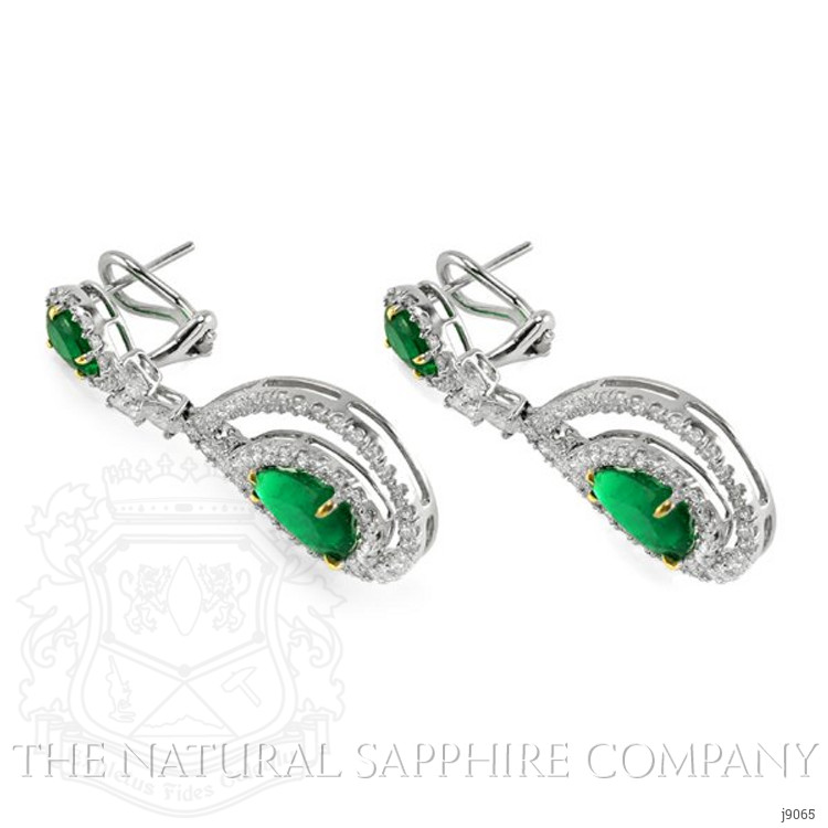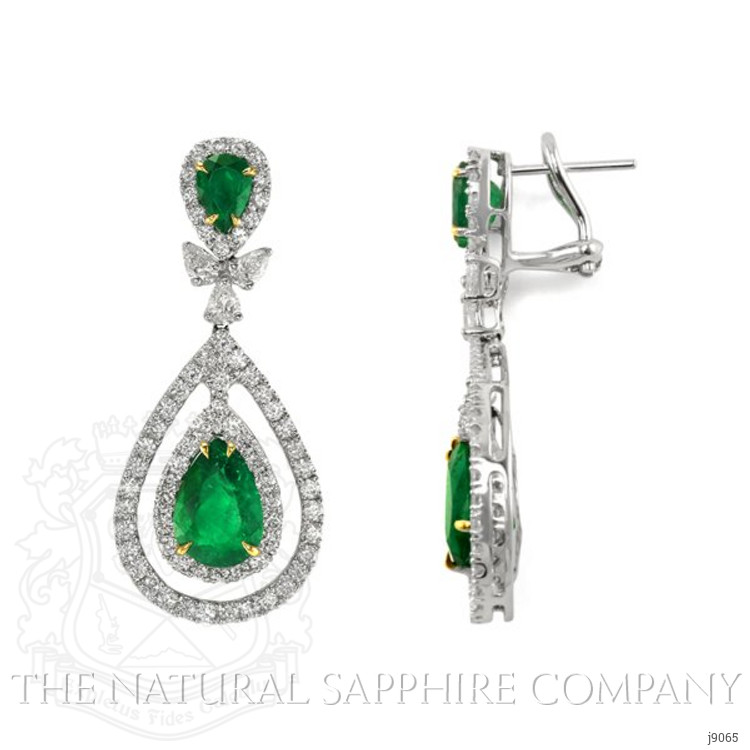 The earrings primarily features with 4 green pear shaped mixed brilliant cut emeralds C.Dunaigre certified , weighing a total of 7.19 carats. The emeralds have a clarity grade of very slightly included, and color saturation of vivid. Also featured in the earrings are 140 white various shaped mixed brilliant cut natural diamonds, weighing a total of 3.88 carats. The natural diamonds have a clarity grade of vvs1 - Very Very Slightly Included., F color The earrings are entirely set in 14K white gold and 14K yellow gold.