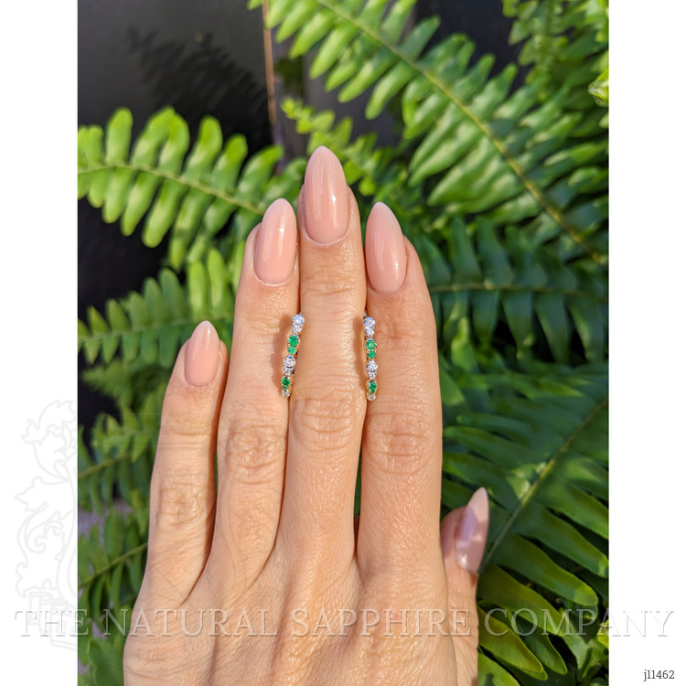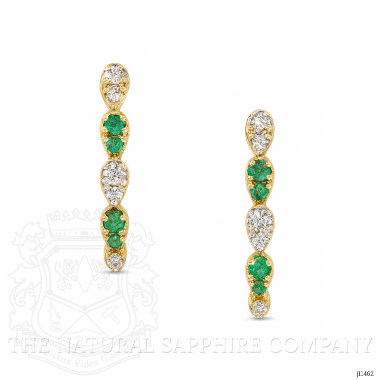 These earrings are crafted entirely in 14K yellow gold, presenting a slim vertical silhouette that balances refined proportion with a deliberate emphasis on light and color. Each earring features a linear sequence of alternating round emeralds and round brilliant diamonds, set to maximize faceting and fire against the warm gold backdrop. The gemstones are held in secure settings that allow unobstructed entry of light, producing consistent scintillation as the wearer moves. The polished yellow gold finish provides a smooth, reflective plane that complements the lively green of the emeralds and the icy flash of the diamonds, while the discreet post closure is engineered for reliable daily wear and a comfortable fit at the earlobe.