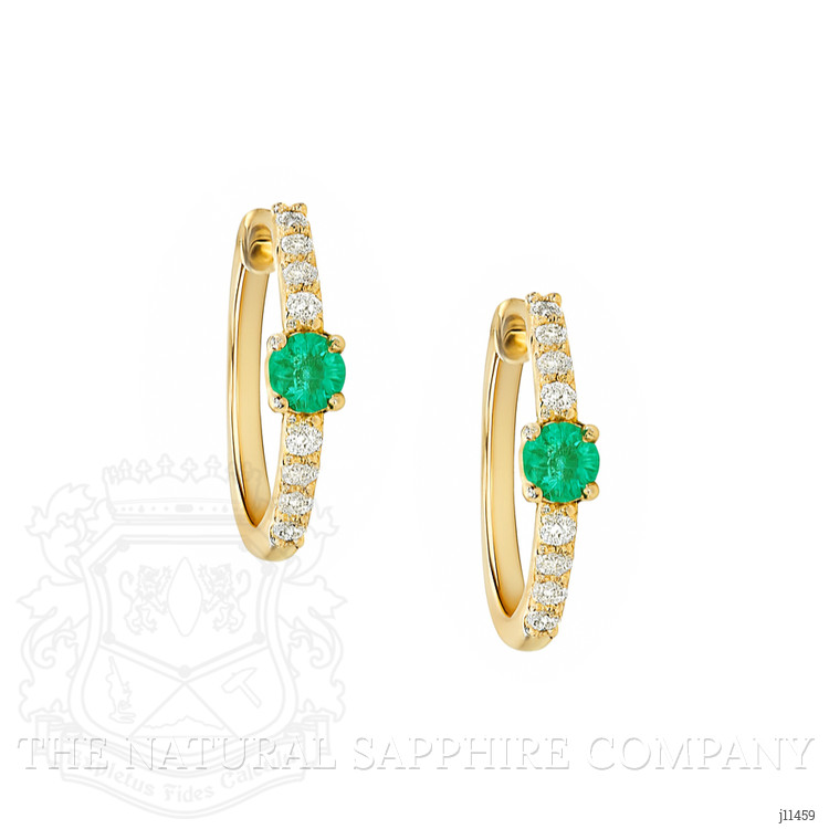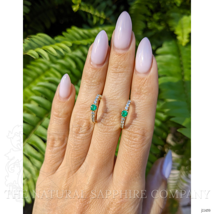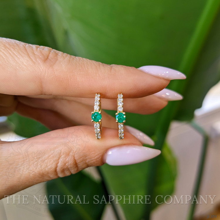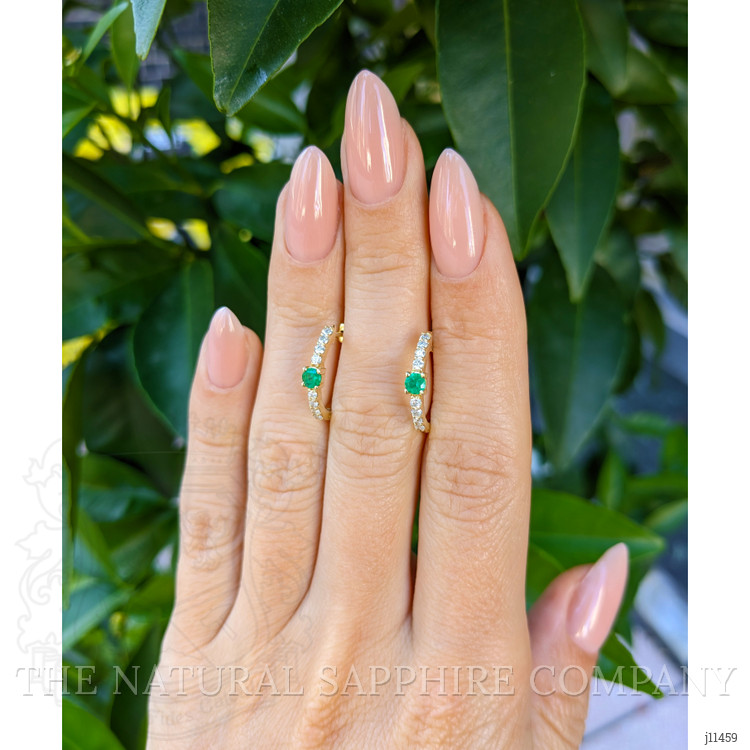 At the visual center of each hoop, a round faceted emerald is presented in a minimal multi prong crown, the prong geometry kept narrow and closely counter sunk into the gold to expose as much of the stone’s crown and table as possible. The emeralds are faceted with a dense crown facet pattern typical of small round faceted stones, a pattern designed to prioritize face up color and controlled light return rather than the extreme brilliance favored in diamond cutting. These facet proportions increase the saturation and apparent depth of the green, while maintaining lively internal reflections. Color grading for these emeralds favours a vivid green with medium to strong saturation, and a slightly bluish secondary tone that reads as a clear, intense green in daylight and under warm interior lighting. Clarity is managed through selective sourcing and matching, accepting the characteristic minor internal features of natural emeralds, while ensuring that those features do not interrupt the visual plane at the table. The prong setting allows light to enter through the pavilion and reflect off the polished gold interior and the pavé field, producing a face up intensity that is greater than a similar stone set flush or fully bezelled.