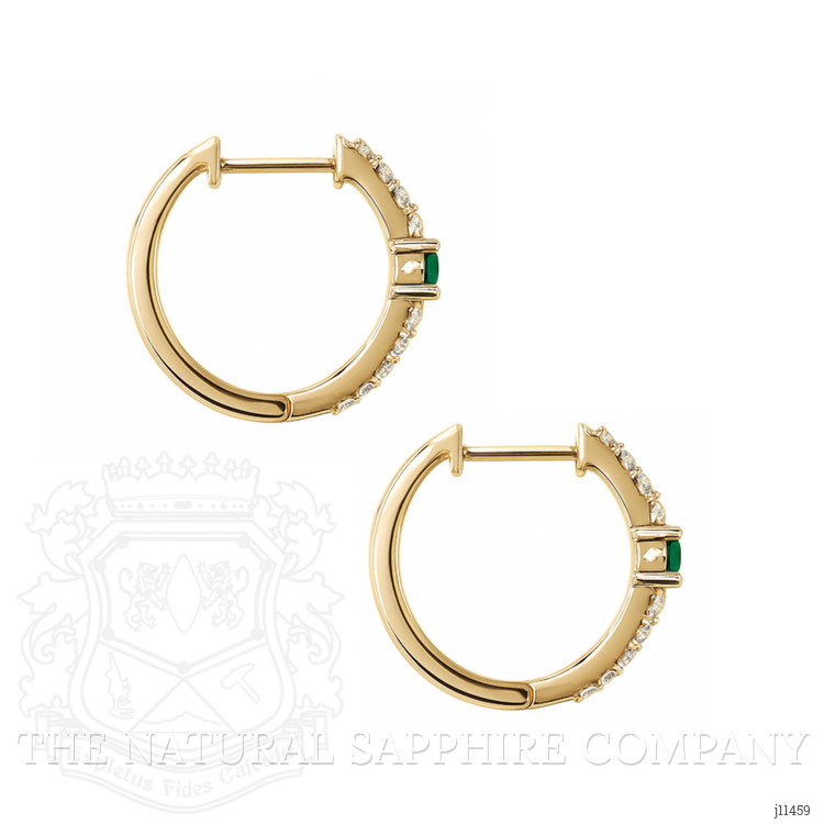 These earrings are executed entirely in 14K yellow gold, the metal choice selected for its optical warmth, durability, and ability to complement cooler green tones. The overall form is a low profile hoop, engineered with a discrete hinge and snap closure to ensure a consistent seat against the ear and to minimize rotational movement. The front face of each hoop is finished with a micro pavé field of round brilliant melee diamonds, each diamond bead set with tight spacing and uniform table orientation to create an even scintillation plane. The pavé work is cut into a precisely milled channel on the hoop face, the seat depth calibrated so that the diamond crowns sit slightly proud of the gold plane, maximizing light exposure while preserving a smooth silhouette. The interior and reverse faces of the hoop receive a high polish and a slightly contoured cross section, a subtle ergonomic choice that reduces profile thickness at the lobe, improves wearer comfort, and also contributes to the reflected light bathing the gemstones from below.