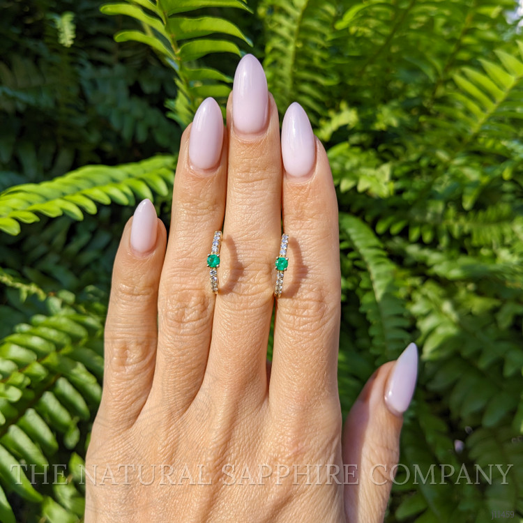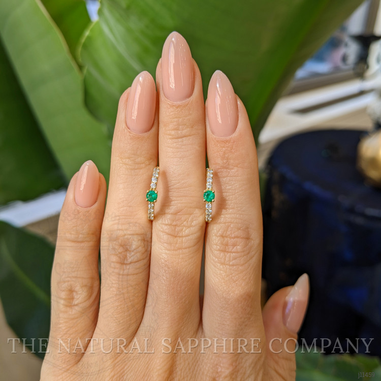 The setting architecture has been conceived to enhance the gemstones natural beauty through a combination of optical contrast, reflective amplification, and restrained metalwork. The warm yellow of the 14K gold increases the perceived saturation of the green, the adjacent near colorless melee diamonds provide a high frequency scintillation field that frames the emeralds, increasing their visual pop by contrast. Mechanically, the micro pavé channel functions as a luminous halo without the opacity of a full bezel, the many small facets of the diamonds scattering light into the emerald pavilion where the internal facet network converts that energy into depth of color. Additionally, the polished inner face of the hoop and the undercut beneath each emerald act as reflective planes, returning light through the crown facets and enhancing both brilliance and perceived clarity. The prongs are hand fettled and polished, their contact points minimized and smoothed to avoid color distortion around the girdle, while still providing secure mechanical retention. The hoop curvature itself is a design choice that creates dynamic changes in light incidence with motion, producing intermittent flashes of green and white that reveal both the cut character of the emeralds and the precise calibrations of the pavé diamonds. Taken together, the material choices, faceting considerations, and finishing techniques yield a pair of earrings that reads as both technically sophisticated and intrinsically luminous, an object where the setting acts as an optical tool to reveal the best attributes of the stones, rather than as mere surrounding metal.