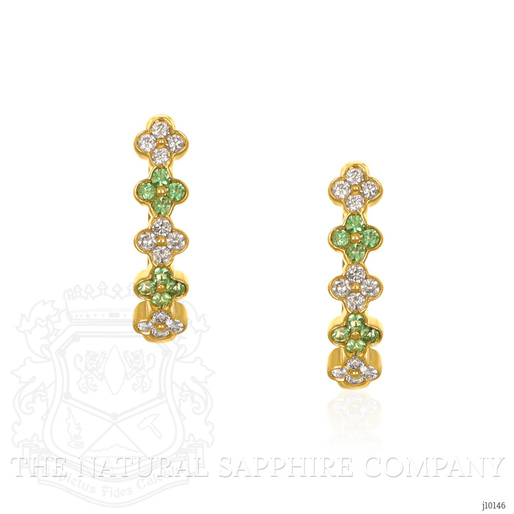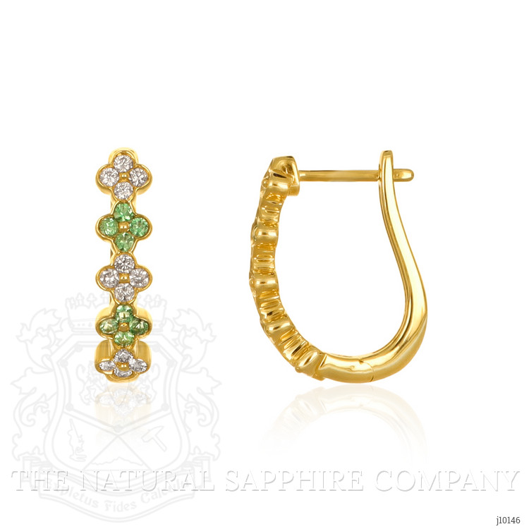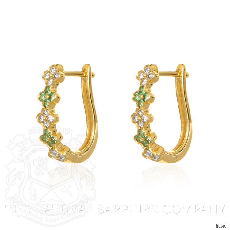 The earrings feature a splendid array of 16 green round-shaped mixed brilliant cut emeralds, totaling 0.24 carats. With their intense color saturation, these emeralds bring a vivid brilliance to the design. Despite having a slightly included clarity grade, these green gems maintain an alluring sparkle, ensuring they stand out in any setting.