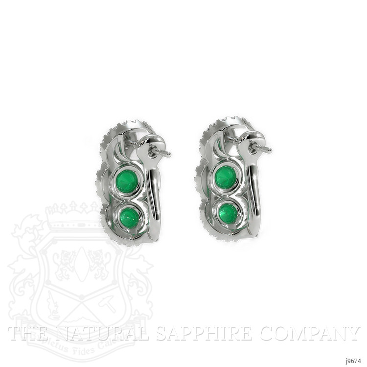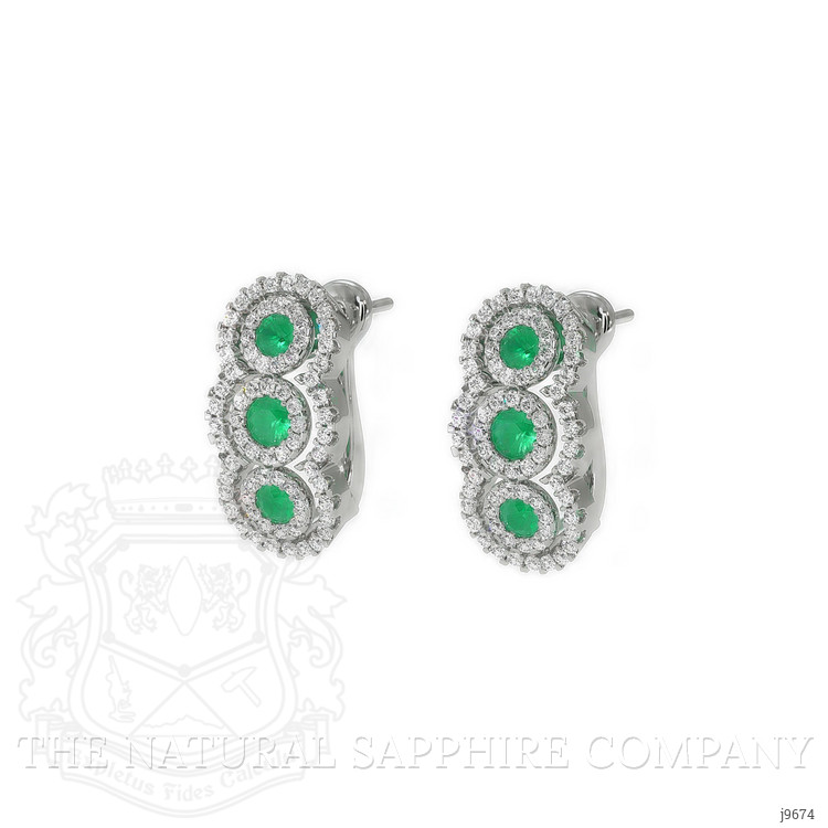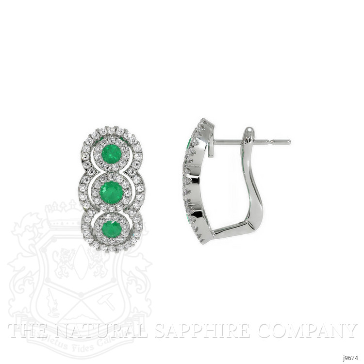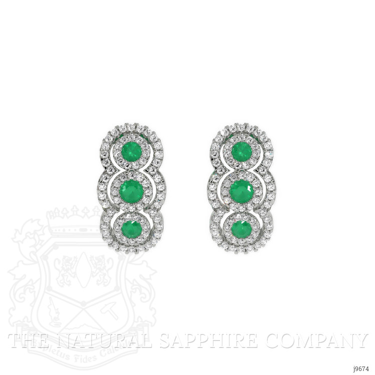 The earrings primarily feature a beautiful, transparent pair of emeralds that are 0.36 total carat weight. They are round shape green emeralds, with the dimensions of 2.60 x 2.60 x 1.80 mm and are brilliant cut, have a clarity grade of very slightly included (evaluated at eye level), vivid color intensity, and an excellent polish. The origin of this pair of emeralds is Zambia. Featured in the earrings are 144 white round shaped brilliant cut natural diamonds, weighing a total of 0.42 carats. The natural diamonds have a clarity grade of vs2 - Very Slightly Included., F color Also featured in the earrings are 4 green round shaped brilliant cut emeralds, weighing a total of 0.30 carats. The emeralds have a clarity grade of very slightly included, and color saturation of vivid. The earrings are entirely set in 18K white gold.