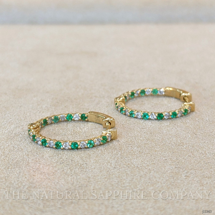 These hoop earrings are exquisitely set entirely in 14K yellow gold, and they present an alternating strand of vivid green emeralds and bright white diamonds, creating a rhythm of color and fire that is immediately apparent when worn. The design favors matched melee stones, each carefully graduated and calibrated so that the eye reads a continuous, balanced line of color and scintillation. From a stylistic standpoint the hoops are small and refined enough for everyday wear, while their full stone setting and quality materials allow them to transition effortlessly into evening wear. For the educated buyer this piece offers both aesthetic refinement and technical attention to detail, the alternating gemstones serving not only as decoration but as a study in contrast, where the cool brilliance of diamonds enhances the depth and saturation of the emeralds, and the warm metal of 14K yellow gold intensifies the green tone in a way that plating or lower karat alloys cannot replicate.