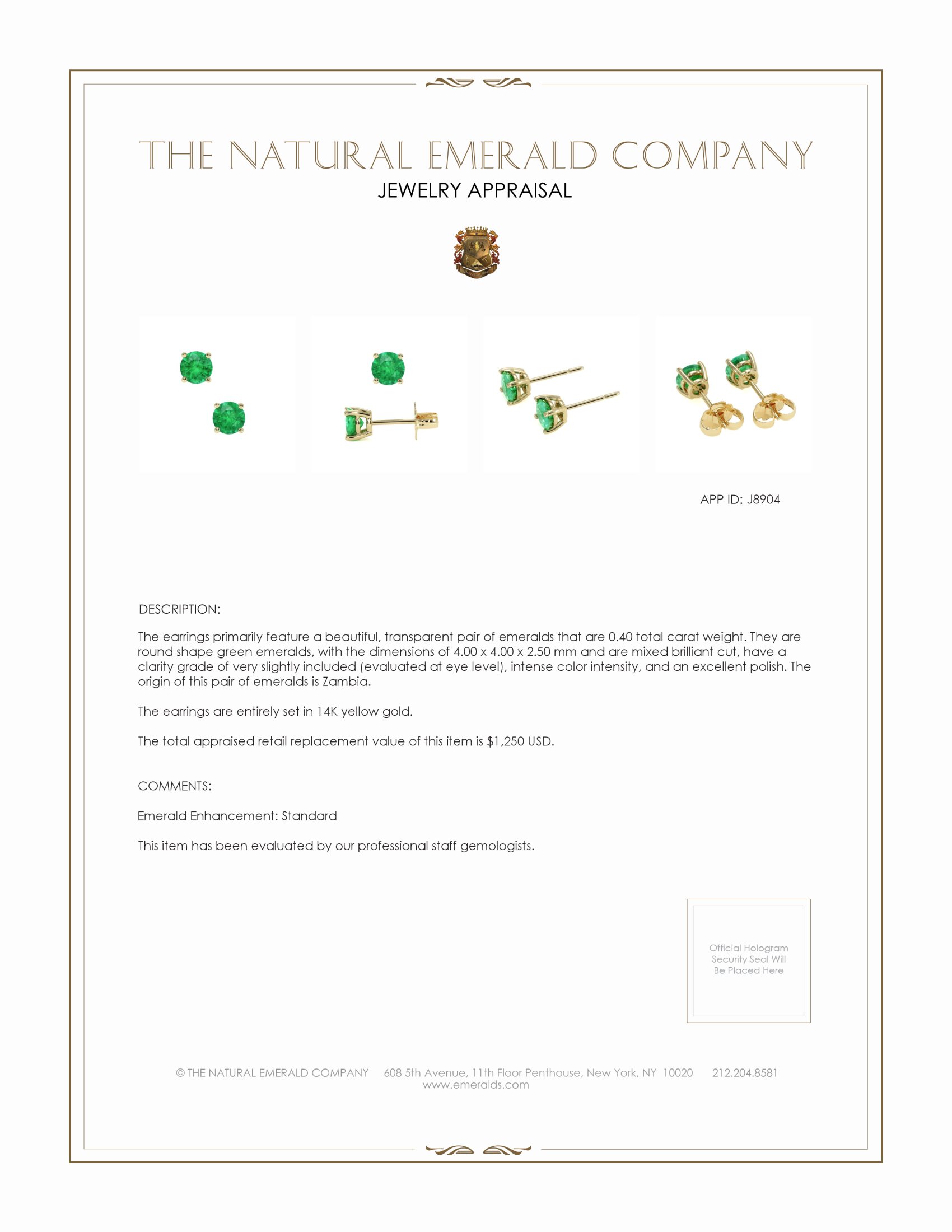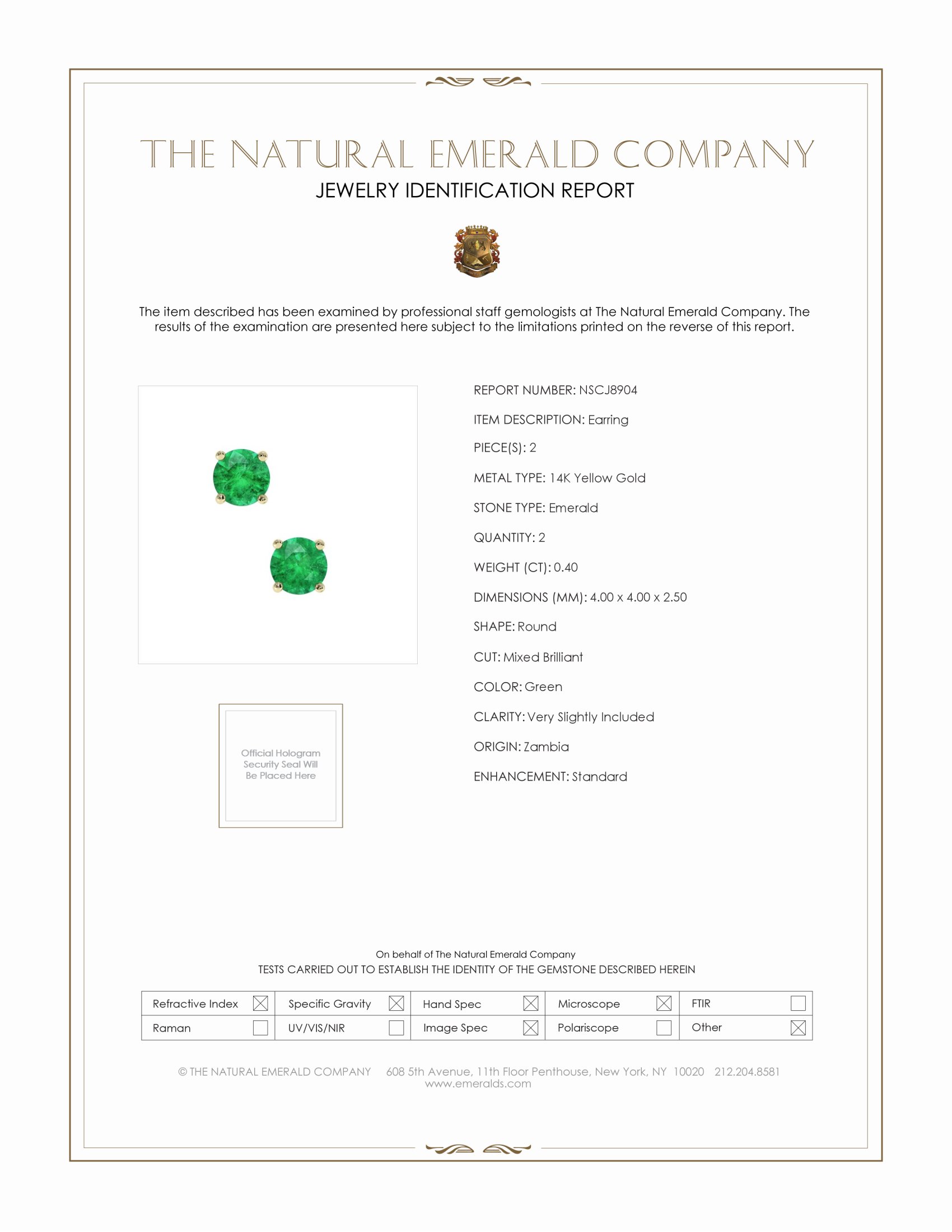 The pair of round-shaped, mixed brilliant-cut emeralds at the heart of these earrings showcases the magnificent 0.40 total carat weight you have been searching for. Belonging to a rare category, they exhibit an intense color intensity and an excellent polish that brings out the pure richness of their hue. Furthermore, they possess a clarity grade of very slightly included, ensuring that even the closest scrutiny does not detract from their pristine allure. Sourced from the renowned emerald origins of Zambia, each gemstone whispers tales of mystical lands, resonating with a deep international prestige that sets them apart.