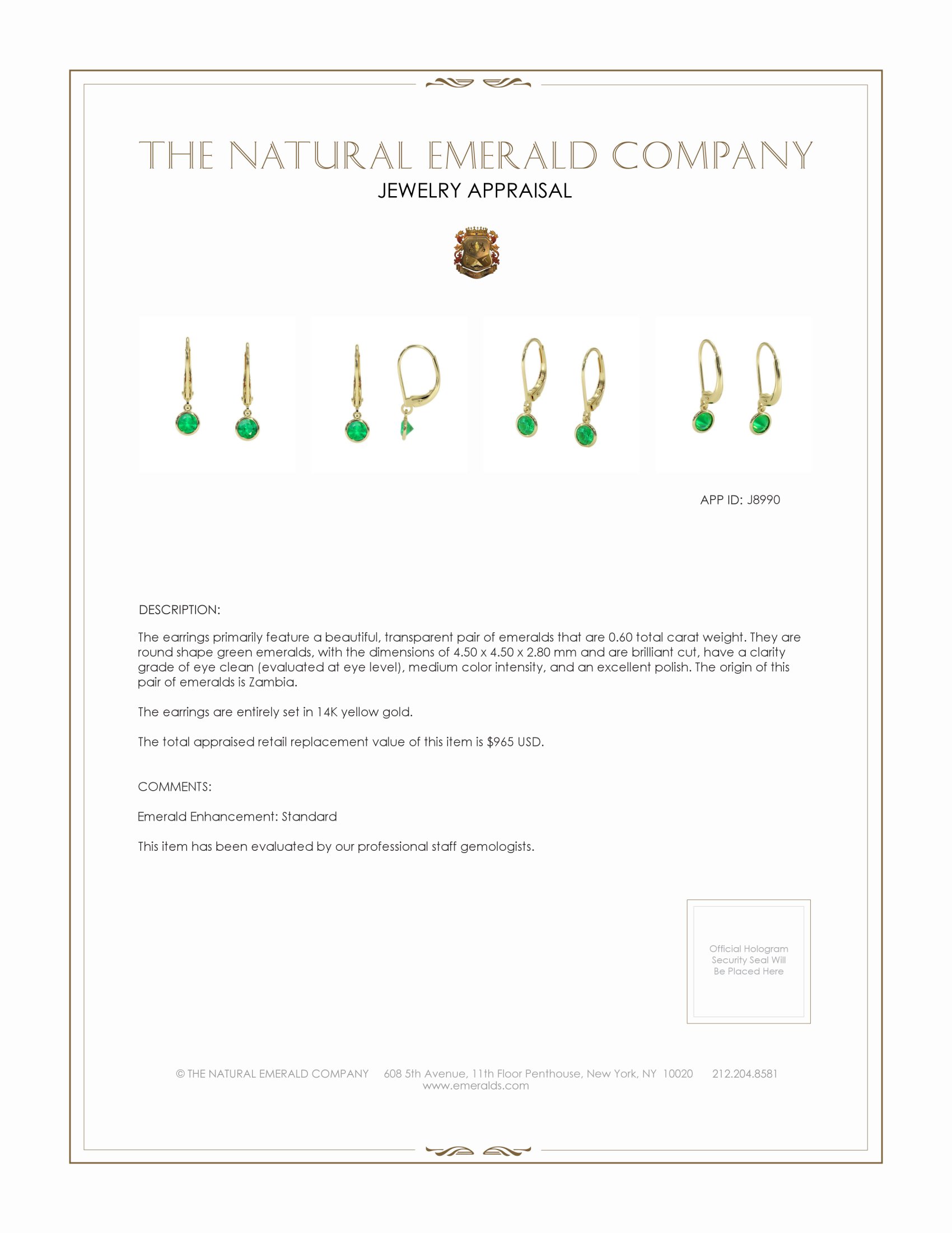 The clarity of these Emeralds is 'eye clean,' a mark of superior quality, as evaluated at eye level. These gems possess an excellent polish, ensuring that they reflect light with a pristine shine consistent with only the finest pieces. The proprietary enhancement standard used is a testament to The Natural Emerald Company’s commitment to enhancing natural beauty while maintaining authenticity, making these earrings not just an accessory, but a symbol of taste and exclusivity. Anyone who chooses to adorn themselves with this pair is not merely choosing an aesthetic addition, but a statement of status and distinction.
