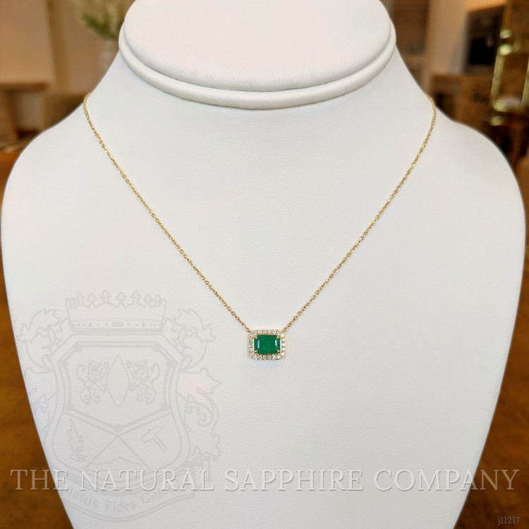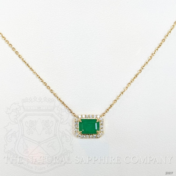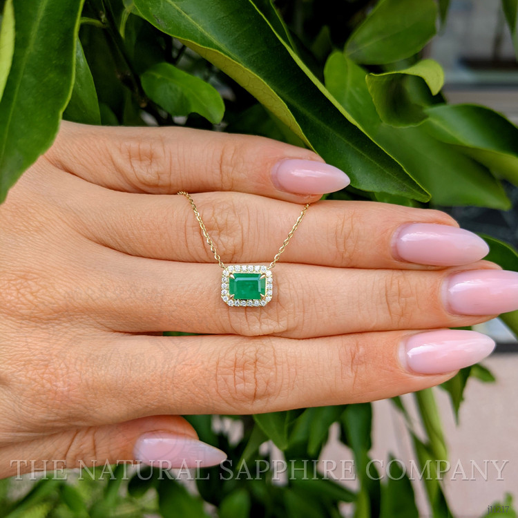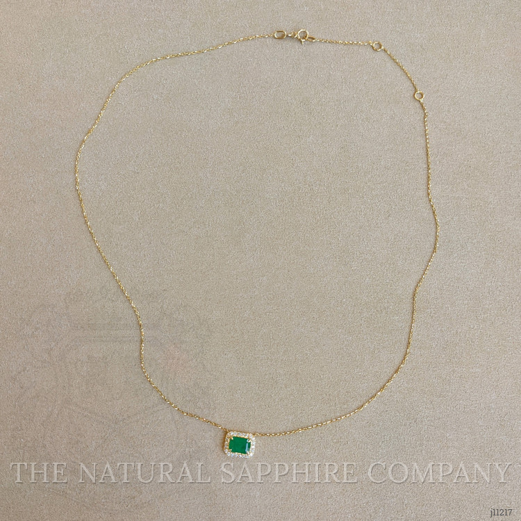 Surrounding the emerald is a delicate halo of diamonds, each meticulously set to enhance the overall brilliance and fire of the piece. These diamonds are selected not only for their impeccable clarity and superior cut but also for their ethical sourcing and certification, ensuring every aspect of this necklace aligns with the conscientious buyer's values. The diamonds provide a sparkling contrast to the emerald, their fire serving to accentuate the rich, deep color, while the 14K yellow gold setting adds a warm and inviting tone that complements all skin tones.