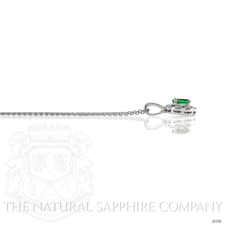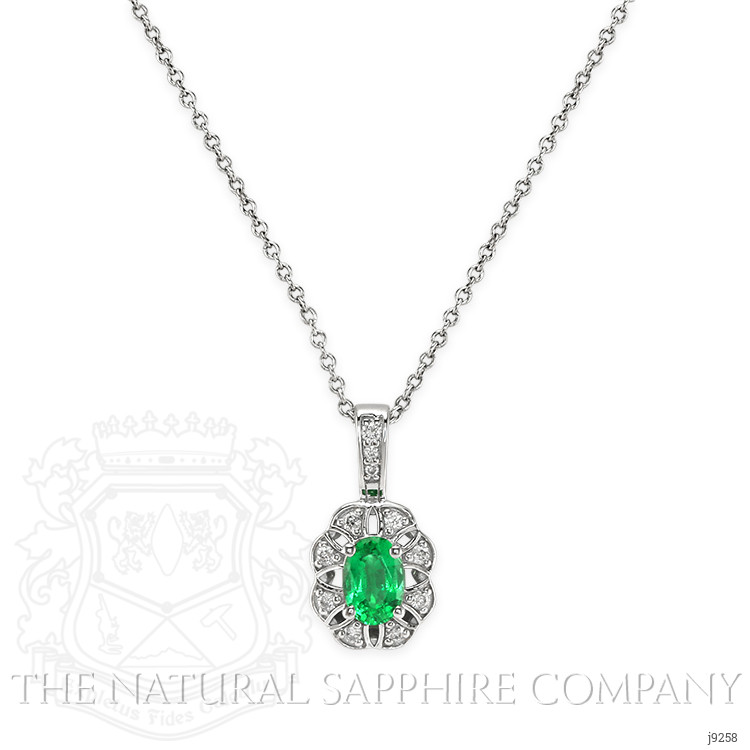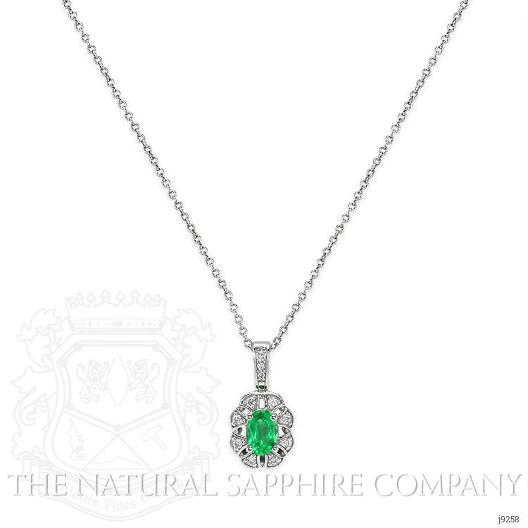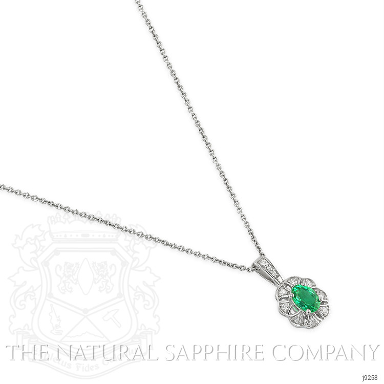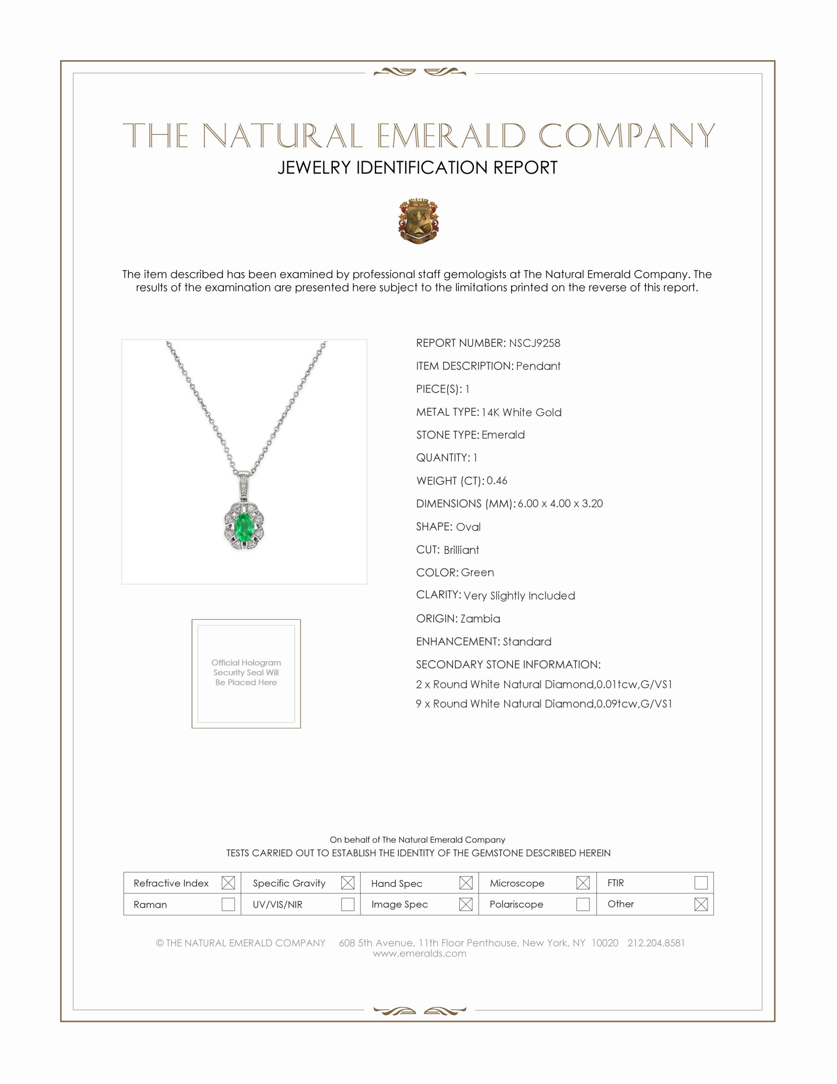 The following stones comprise the lovely pendant and are entirely set in 14K white gold. The pendant primarily features a beautiful, transparent 0.46 carat oval shape green emerald with the dimensions of 6.00 x 4.00 x 3.20 mm and is brilliant cut. It has a clarity grade of very slightly included (evaluated at eye level), vivid color intensity, and an excellent polish. The origin of this emerald is Zambia. Featured in the pendant are 2 white round shaped brilliant cut natural diamonds, weighing a total of 0.01 carats. The natural diamonds have a clarity grade of vs1 - Very Slightly Included, G color, and color saturation of g. Also featured in the pendant are 9 white round shaped brilliant cut natural diamonds, weighing a total of 0.09 carats. The natural diamonds have a clarity grade of vs1 - Very Slightly Included, G color, and color saturation of g.