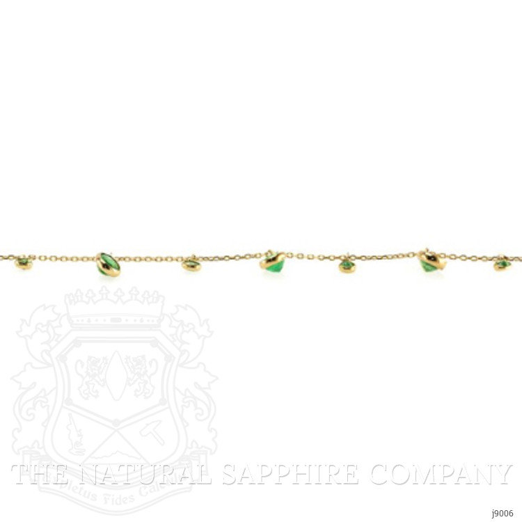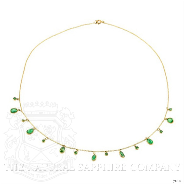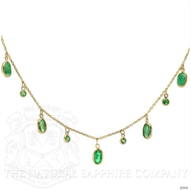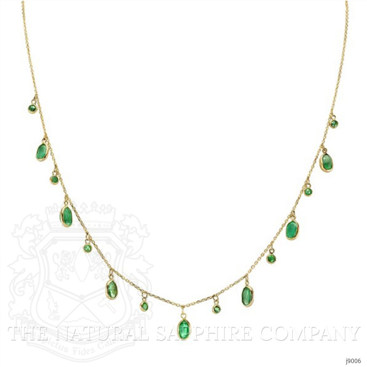 The following stones comprise the lovely necklace and are entirely set in 18K yellow gold. The necklace primarily features with 7 green oval shaped mixed brilliant cut emeralds, weighing a total of 2.60 carats. The emeralds have a clarity grade of very slightly included, and color saturation of intense. Also featured in the necklace are 8 green round shaped mixed brilliant cut emeralds, weighing a total of 0.48 carats. The emeralds have a clarity grade of very slightly included, and color saturation of intense.