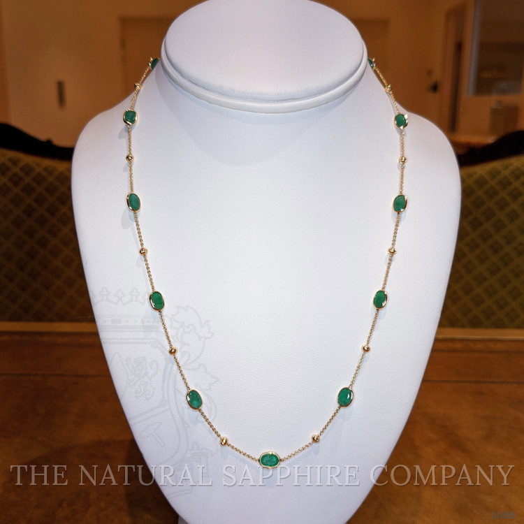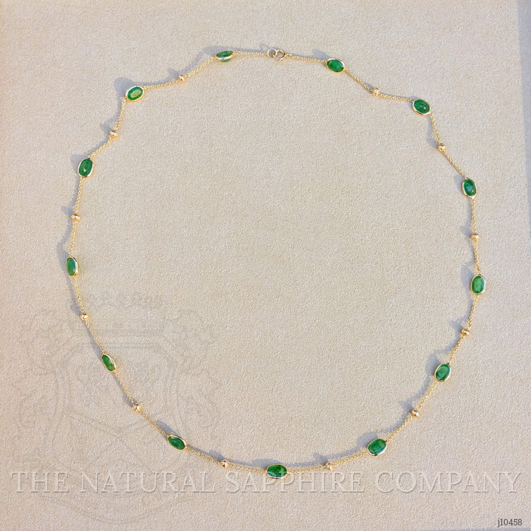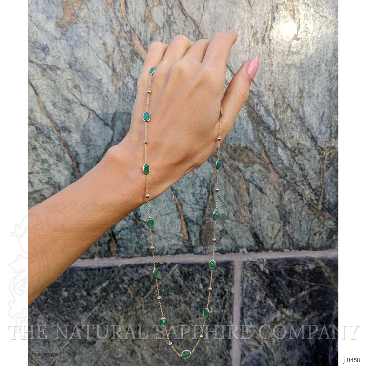 Originating deep within the heart of the Earth, these exquisite green gemstones began their journey thousands of years ago, formed under immense pressure and heat. Each gemstone is a testament to the Earth's incredible geological processes, embodying the raw beauty and power of our planet. Skilled miners delve deep into the Earth, navigating complex networks of tunnels and caverns, to unearth these precious stones. Their expertise and dedication ensure that only the most remarkable gemstones are selected, carefully extracting each one to preserve its natural allure. This meticulous process respects the history embedded in earth's layers and honors the artistry inherent in every unpolished gem.Once retrieved, the stones are entrusted to experienced artisans whose craftsmanship brings the gemstones to life. In workshops filled with light and precision tools, the artisans cut and polish each stone, revealing a stunning depth of color and clarity that captures the essence of its natural origins. The green hues, reminiscent of lush forests and tranquil meadows, evoke a sense of serenity and growth.These polished stones are then set in 14K yellow gold, a metal chosen for its timeless beauty and durability. The gold setting enhances the gemstones' vibrant tones, creating a harmonious blend of earthy elegance and refined sophistication. As the necklace takes shape, it becomes more than a piece of jewelry; it evolves into a work of art, a narrative woven through materials and history.This necklace does not merely adorn the wearer; it transforms them, imbuing a sense of elegance and confidence. As it drapes gracefully around the neck, it bears the legacy of its origins, telling a story of transformation that resonates with the wearer. The effortless blend of natural splendor and human artistry ensures that each necklace is unique, a tangible connection to the Earth's enduring beauty. In essence, this necklace symbolizes a journey from nature's depths to crafted elegance, a history captured in every shimmering gemstone. The wearer becomes part of this narrative, embracing the elegance and confidence that such a storied piece bestows.