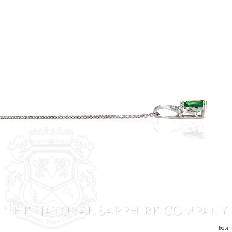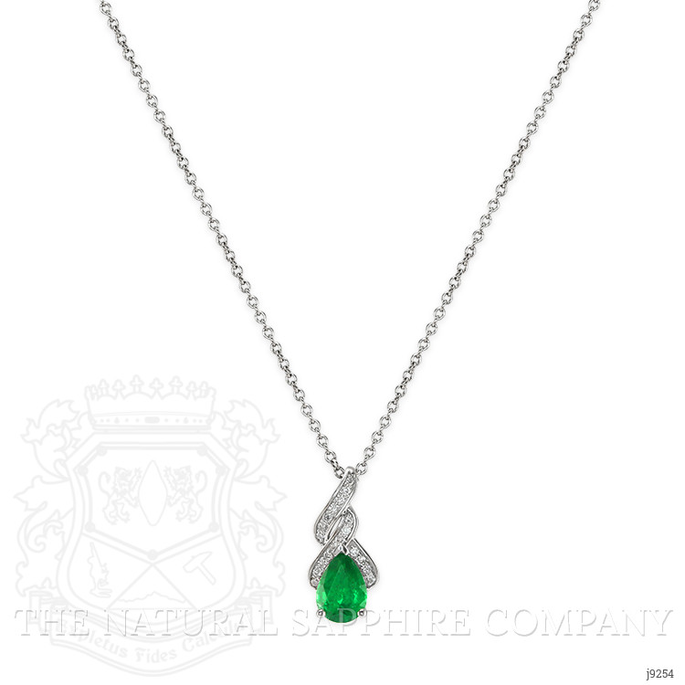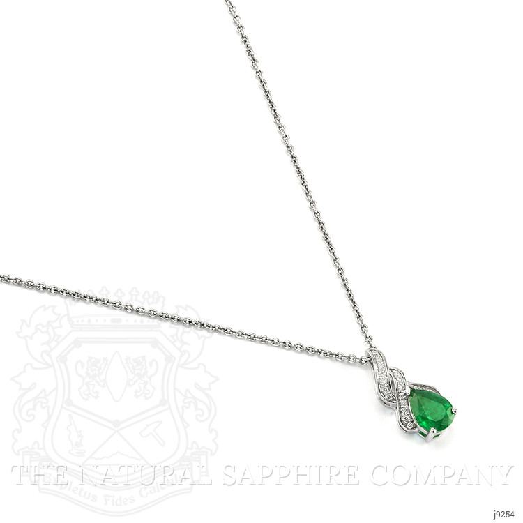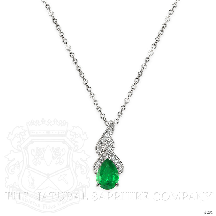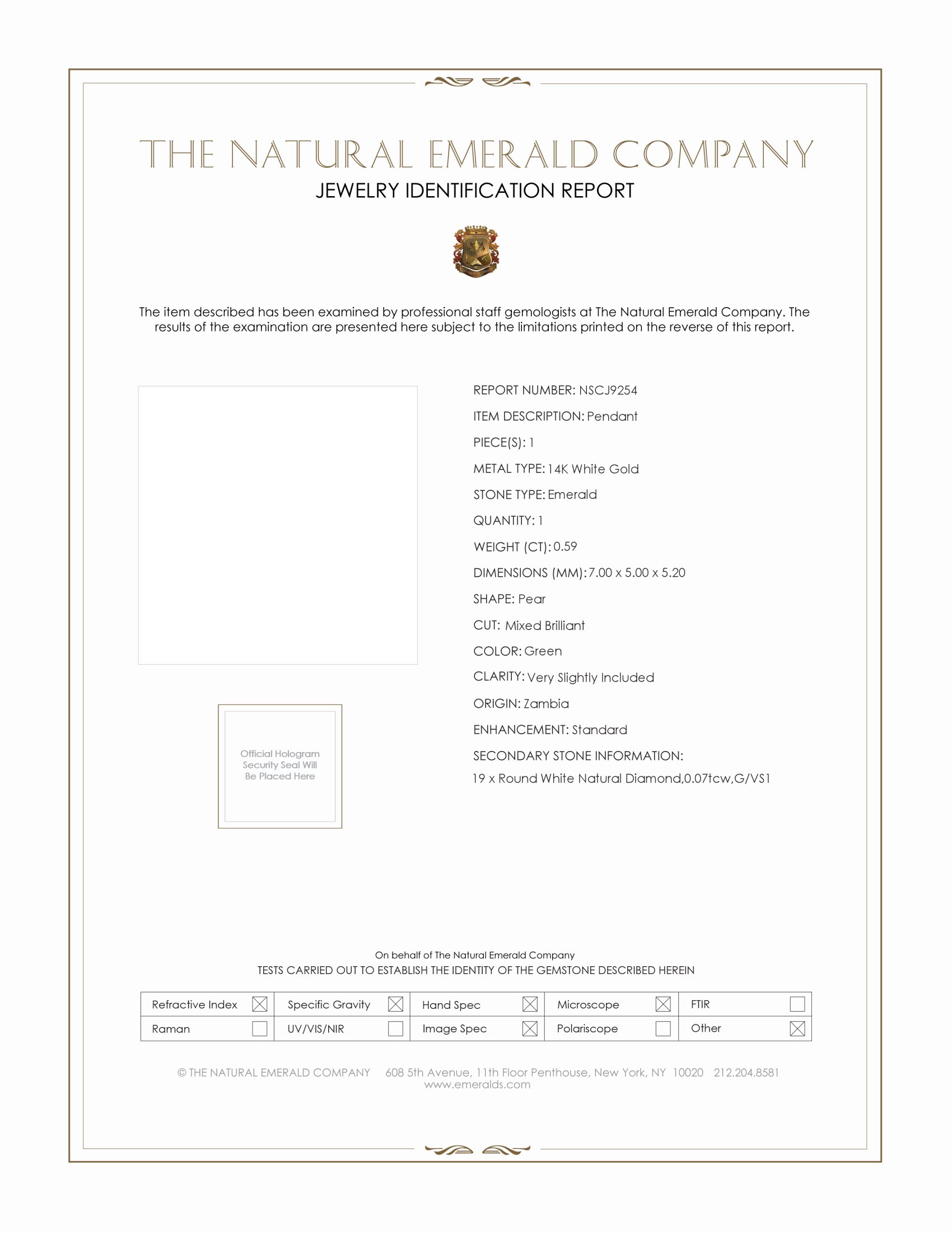 The following stones comprise the lovely pendant and are entirely set in 14K white gold. The pendant primarily features a beautiful, transparent 0.59 carat pear shape green emerald with the dimensions of 7.00 x 5.00 x 5.20 mm and is mixed brilliant cut. It has a clarity grade of very slightly included (evaluated at eye level), vivid color intensity, and an excellent polish. The origin of this emerald is Zambia. Also featured in the pendant are 19 white round shaped brilliant cut natural diamonds, weighing a total of 0.07 carats. The natural diamonds have a clarity grade of vs1 - Very Slightly Included, G color, and color saturation of g.