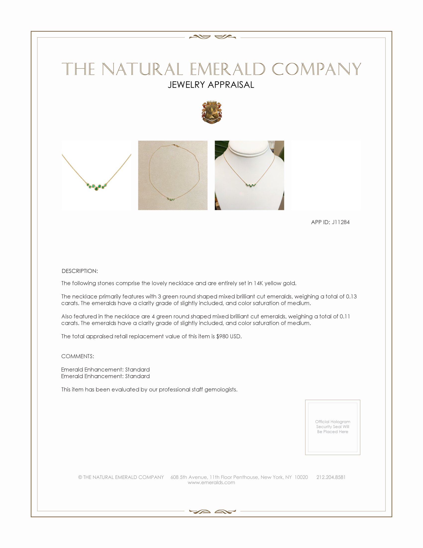Set in luxurious 14K yellow gold, each emerald is carefully positioned to reflect optimal light, enhancing its natural beauty. The gold adds warmth and a traditional elegance, perfectly complementing the rich green of the emeralds. The necklace’s design, while understated, speaks volumes through its quality and finesse. It offers a perfect balance of simplicity and luxury, suitable for any occasion, from a formal gathering to daily wear. Its light yet durable construct ensures that it drapes beautifully around the neckline.