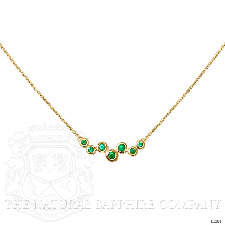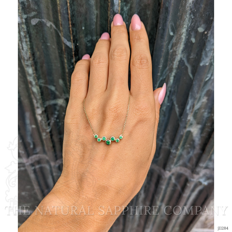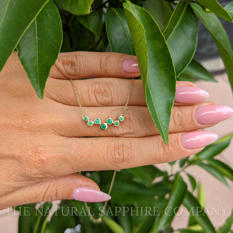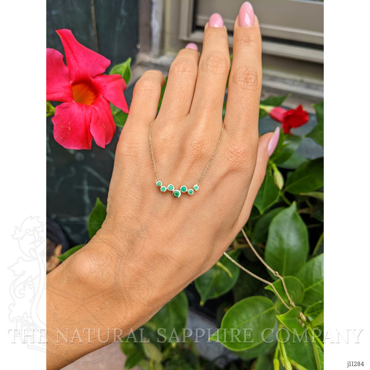 This exquisite necklace features a harmonious arrangement of glistening emeralds, each set meticulously in 14K yellow gold. The necklace embodies elegance and sophistication, making it an ideal adornment for those who appreciate timeless beauty. The story of this piece begins with the careful selection of gemstones, each chosen for its deep color and exceptional clarity. The stones originate from the lush emerald mines of Colombia, renowned for producing some of the finest gems in the world. Each emerald reflects a history of meticulous craftsmanship and a testament to nature's grandeur.