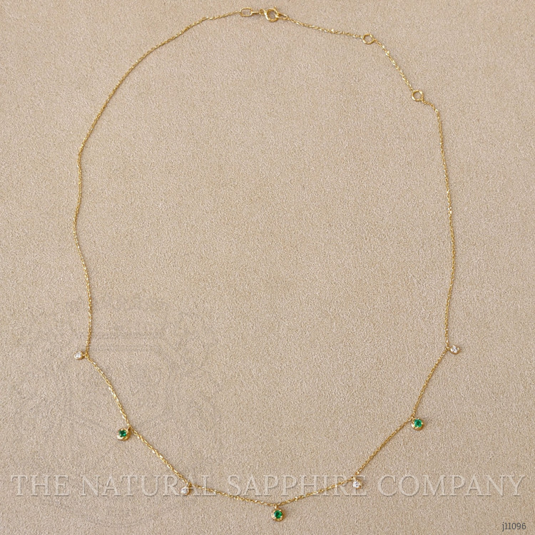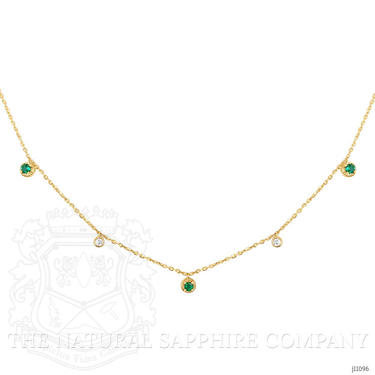 This elegant necklace, a harmonious blend of fine gemstones and meticulous craftsmanship, is an exquisite piece set entirely in 14K yellow gold. The subtle yet captivating charm of this necklace is highlighted by the strategic placement of radiant emeralds and sparkling diamonds. Each stone has been selected for its quality and brilliance, ensuring that the necklace radiates timeless sophistication and elegance. The warm hue of the gold, coupled with the vivid green of the emeralds and the pristine gleam of the diamonds, creates a stunning visual contrast that speaks to the wearer's refined taste.