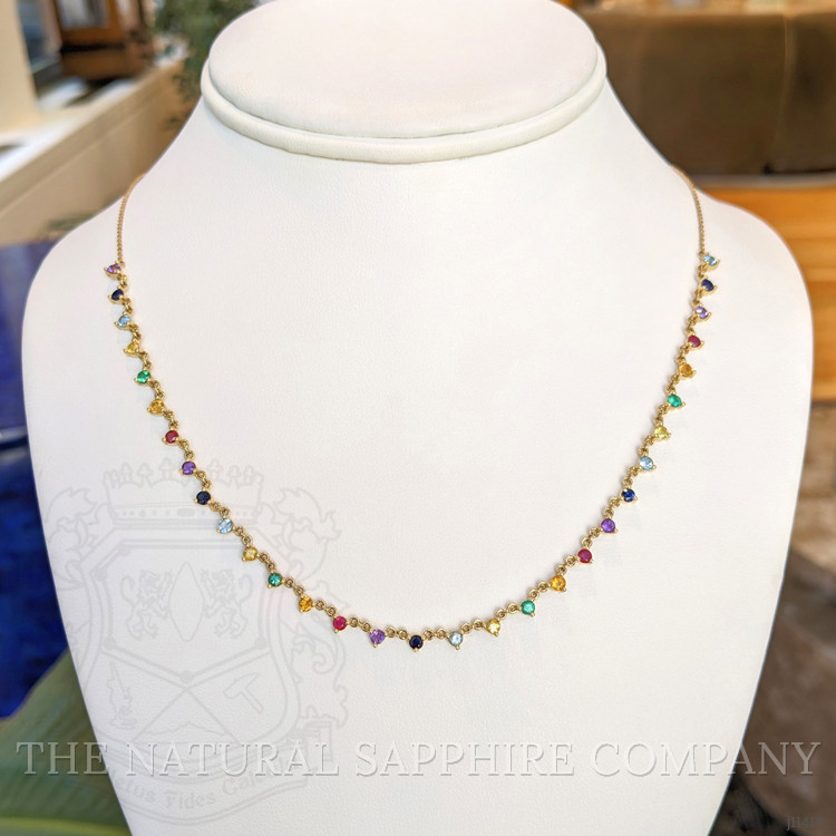 Presenting an exquisite testament to timeless elegance and unparalleled craftsmanship, this luxurious necklace is a celebration of art in adornment, destined to captivate discerning collectors and connoisseurs of fine jewelry. Crafted in meticulously polished 14K yellow gold, this masterpiece is more than just a necklace—it is an ode to sophistication, weaving together the delicate wonders of the gemstone world into a symphony of color and light. The necklace's ethereal beauty is accentuated by an artful arrangement of gemstones, each carefully selected for its unique hue and luster. From the passionate depths of amethyst to the vibrant allure of ruby and the serene tranquility of sapphire, every stone is a reflection of nature's most prized creations, handpicked and expertly complemented by flourishing embellishments.
