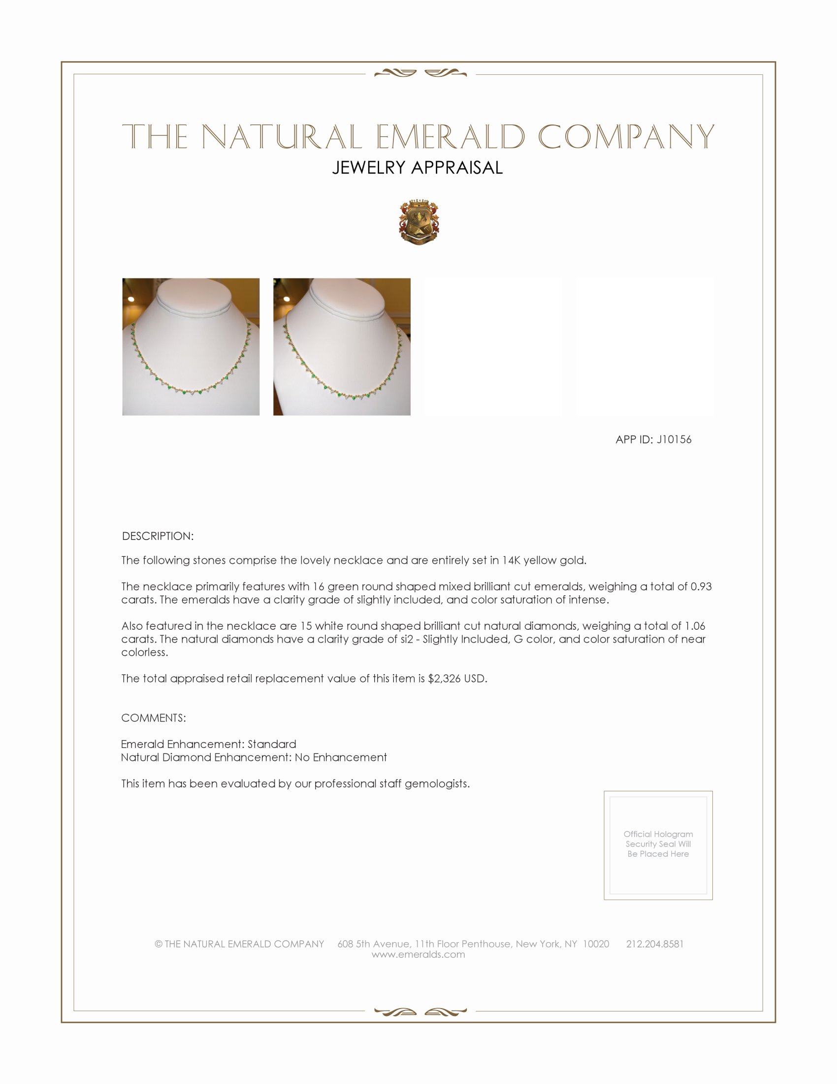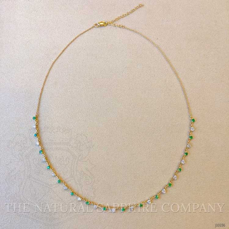 Featuring 16 green round-shaped mixed brilliant cut emeralds, this necklace showcases a total weight of 0.93 carats. The emeralds, with a clarity grade of slightly included, emit a vibrant intensity.