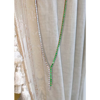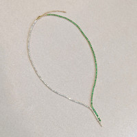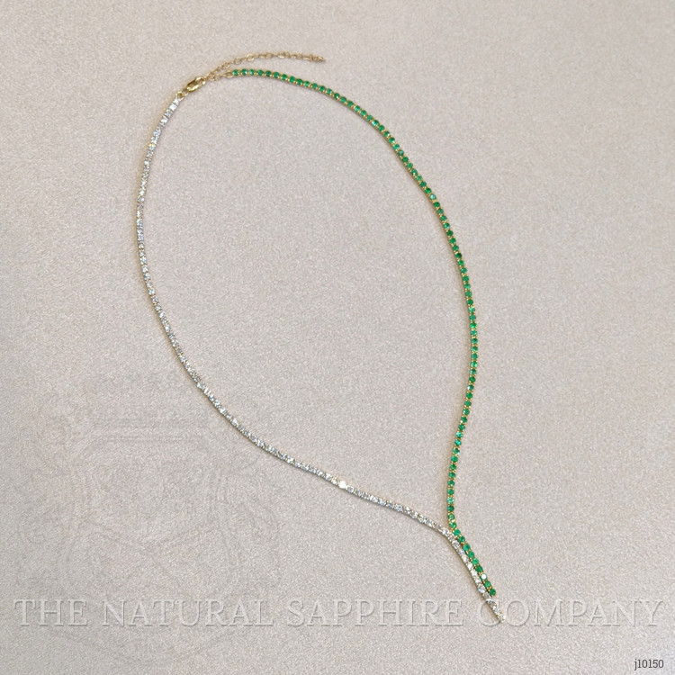 This necklace pairs vivid green emeralds with brilliant white diamonds, each stone precisely set in 14K yellow gold, presenting a considered balance of color and light. The design forms an asymmetric Y shaped silhouette, with one strand of emeralds meeting a parallel strand of diamonds at a refined drop, creating a slender, elongated point that enhances the neckline. Each gemstone is individually mounted in secure prong settings, and the articulated links allow the piece to drape fluidly against the skin. The warm tone of 14K yellow gold provides a subtle contrast that intensifies the emeralds green saturation and accentuates the diamonds fire, while the clean rounded profiles of the stones maintain a contemporary, restrained aesthetic. Craftsmanship details include consistent stone alignment, close tolerances in the joinery, and a polished finish that supports both structural integrity and luminous presentation.
