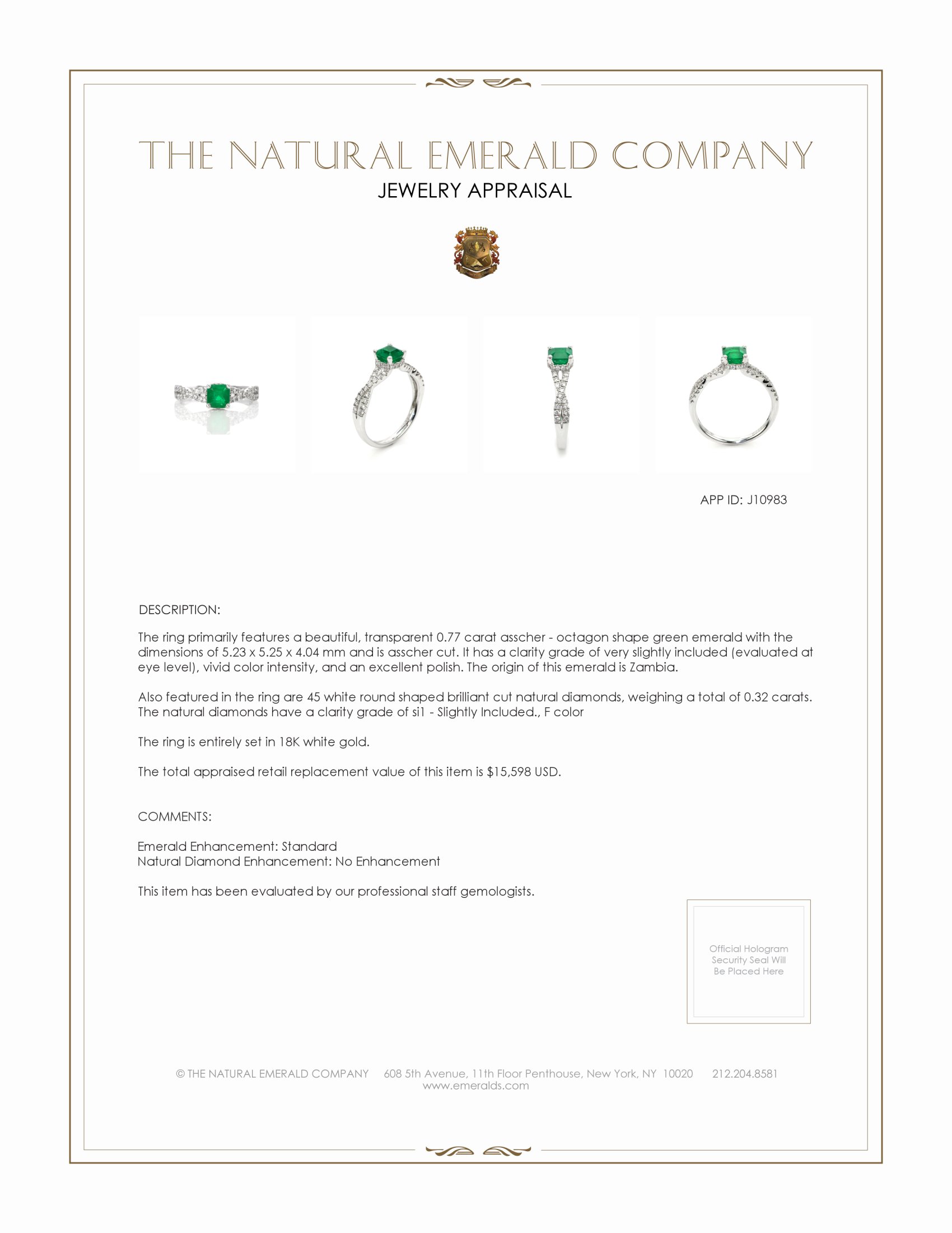 The setting comprises a pristine 18K white gold band, chosen for its ability to complement and elevate the gemstone's stunning green hue. This gold's purity ensures that the ring retains its gloss and resilience, preserving its exquisite nature over time. The band features an interwoven design, where smaller diamonds are meticulously applied, their placement intended to add an unobtrusive sparkle that frames the emerald without detracting from its majesty. These diamonds are graded for color and clarity, appointed only after a rigorous selection process assuring an unmatched level of shine to the complete assembly. The interweaving design is both modern and timeless, embodying sophisticated craftsmanship along with contemporary taste.