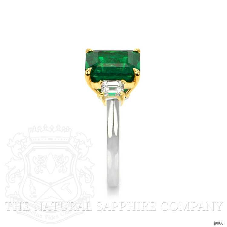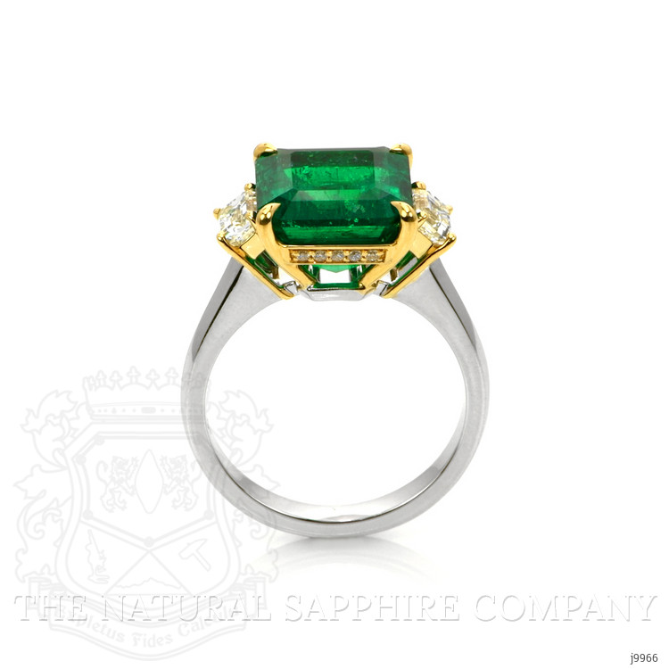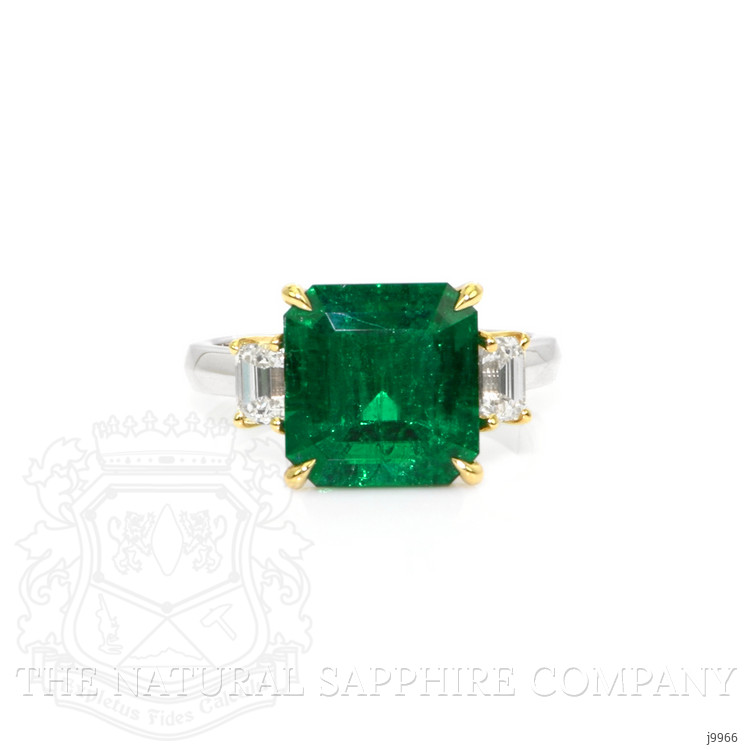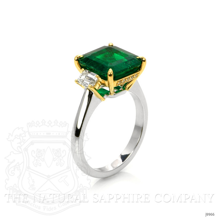 The ring primarily features a beautiful, transparent C.Dunaigre certified 5.20 carat asscher - octagon shape green emerald with the dimensions of 10.70 x 10.29 x 7.33 mm and is asscher cut. It has a clarity grade of slightly included (evaluated at eye level), vivid color intensity, and an excellent polish. The origin of this emerald is Colombia. Featured in the ring are 2 white emerald cut shaped emerald cut natural diamonds, weighing a total of 0.76 carats. The natural diamonds have a clarity grade of vs1 - Very Slightly Included., F color Also featured in the ring are 10 white round shaped mixed brilliant cut natural diamonds, weighing a total of 0.05 carats. The natural diamonds have a clarity grade of vs1 - Very Slightly Included., F color The ring is entirely set in 18K white gold and 18K yellow gold.