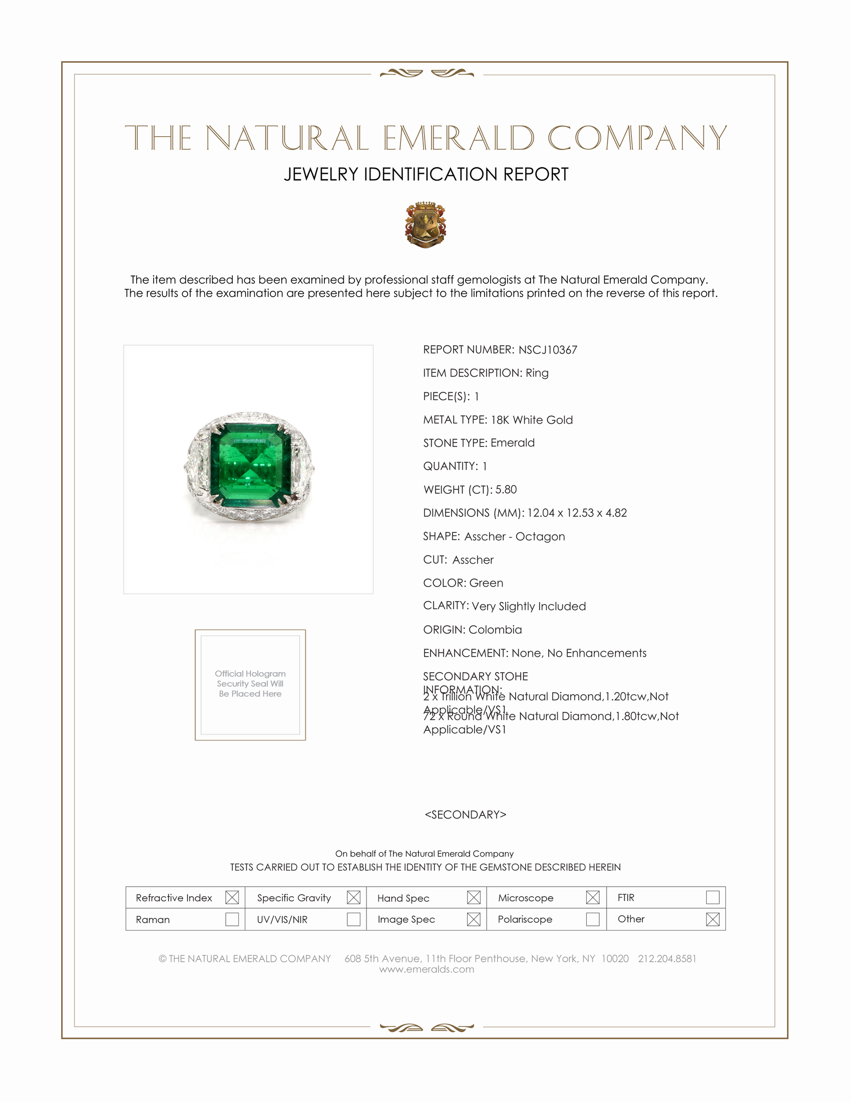 In the serene depths of nature's artistry, where the earth whispers secrets of former eras, a spectacular gemstone emerges – the bewitching Colombian emerald of The Natural Emerald Company. The crown jewel of our creation is a pristine, 5.80 carat emerald, with a captivating interplay of light and depth, reminiscent of a verdant forest drenched in sunlight. This emerald's asscher-cut shape, carved with precision into a mesmerizing octagon, captures an aura of timeless elegance, a serene dance of divine artistry and human mastery. Its vivid intensity draws forth an invincible promise, each facet reflecting a tender dialogue between nature’s perfection and humanity's endless pursuit of beauty.