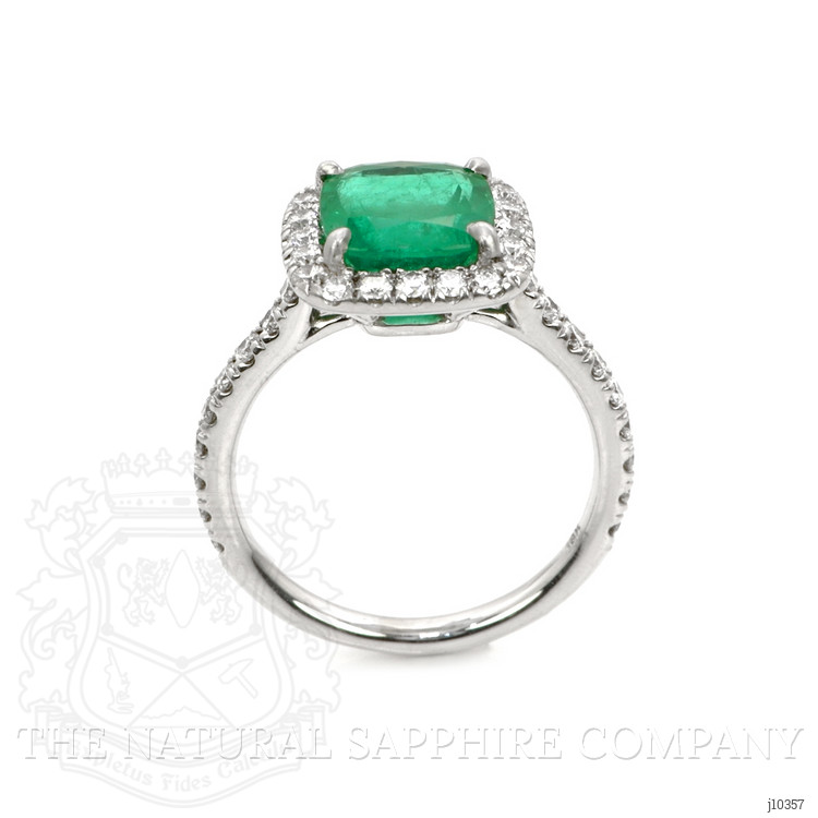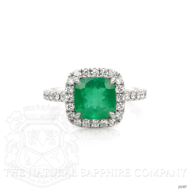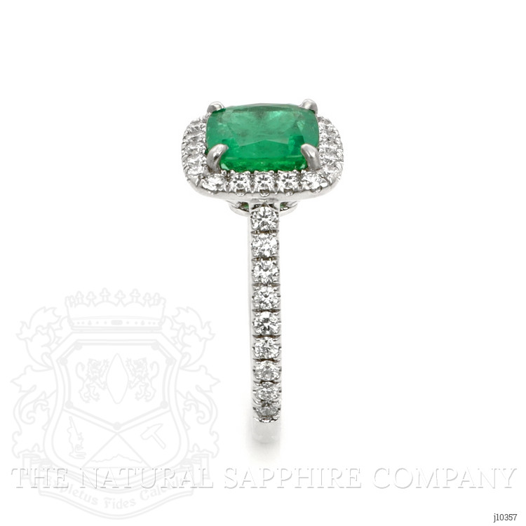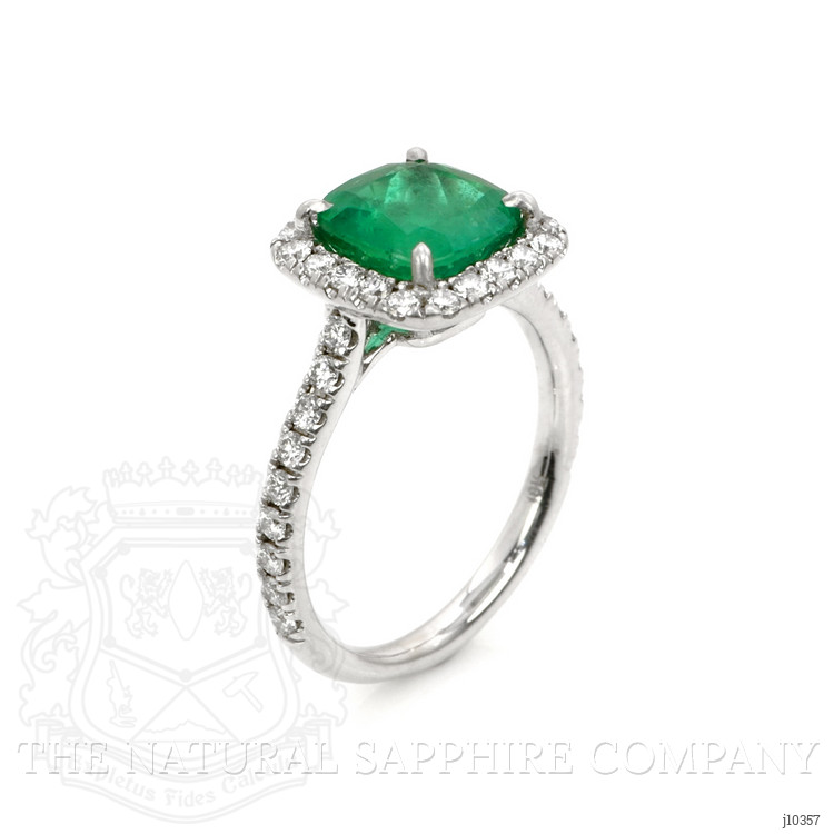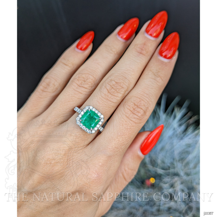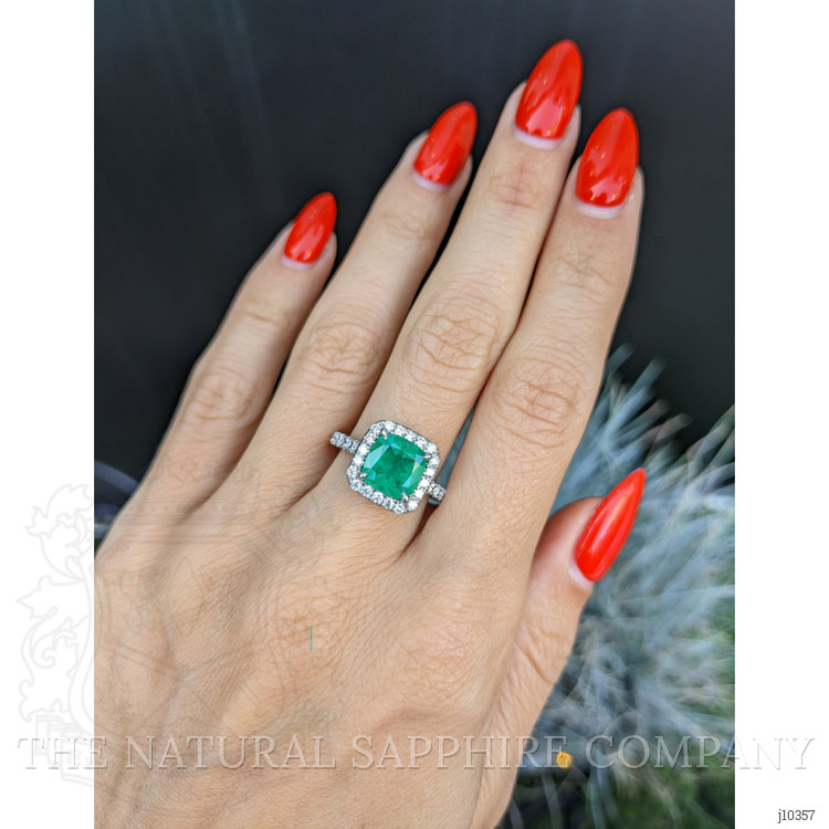 This exquisite ring is meticulously crafted in 18K white gold. At its center, the ring features a resplendent emerald, known for its stunning green hue and captivating luster. The emerald is surrounded by a halo of brilliant white diamonds, adding a layer of sparkling elegance that enhances the overall brilliance of the piece. The band is also set with high-quality diamonds, providing a consistent and luxurious shine around the entire circumference. The quality of the emerald is notable due to its origin, which greatly contributes to its deep color and clarity. Expertly sourced and ethically mined, the origin of the gemstone adds an element of rarity and prestige to the ring. Each diamond in this exquisite piece has been carefully selected and professionally set to ensure a seamless finish. The 18K white gold setting not only offers a robust and durable foundation but also complements the vivid color of the emerald and the exquisite sparkle of the diamonds. This ring is a harmonious blend of exceptional craftsmanship and superior materials, making it a timeless piece of fine jewelry. Its sophisticated design and provenance of the gemstone elevate its appeal, creating a ring that is as significant as it is beautiful.