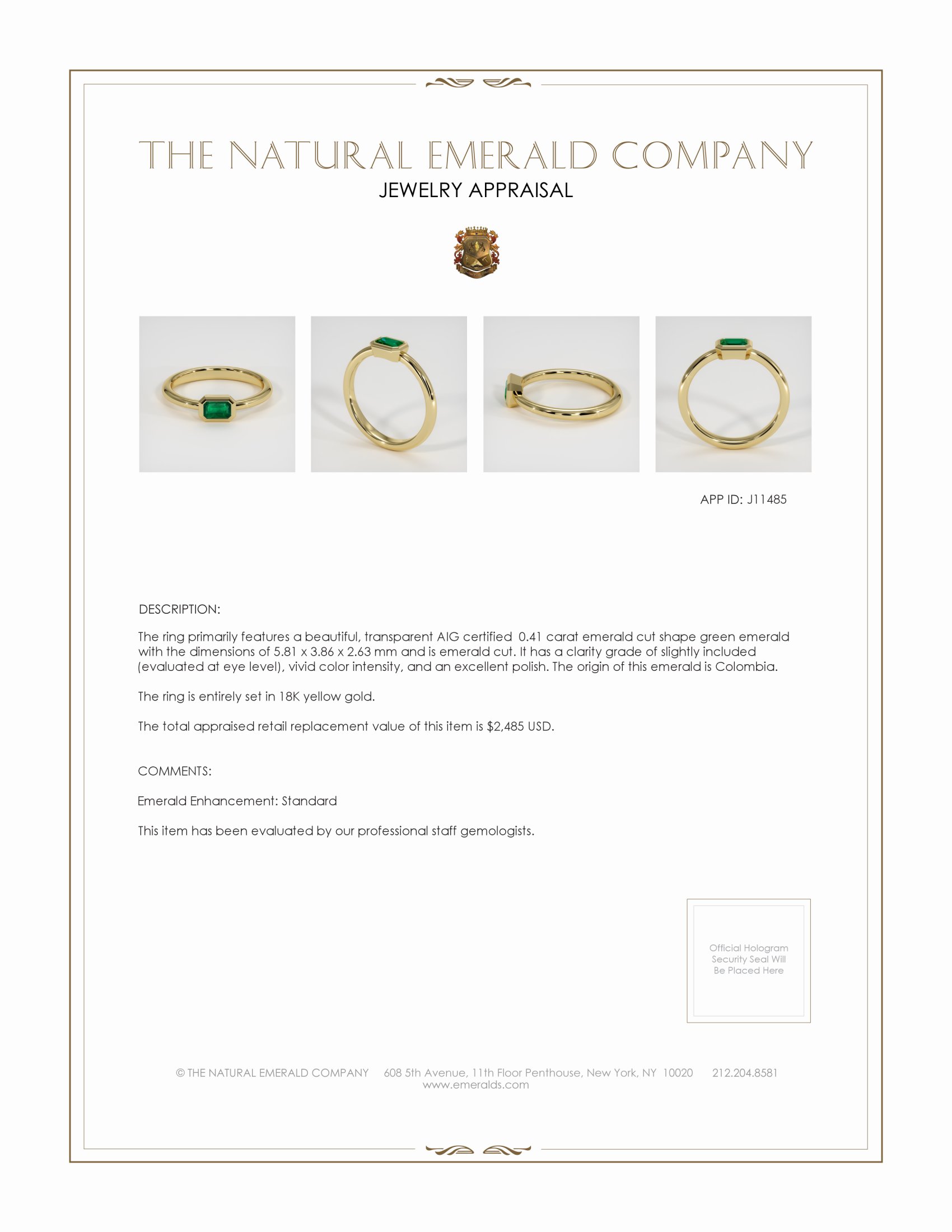 When you place this ring on your finger you are continuing the story of the emerald. It is a piece meant to be lived with, not locked away. The eighteen karat yellow gold patinates gently with time, and the bezel protects the stone while allowing inspections of its interior landscape. Caring for it requires simple devotion, the occasional warm soapy bath, a soft brush, and a visit to the studio for a professional polish when the years collect their quiet scratches. Wearers will find that the ring accrues memories as naturally as the gold warms to skin, and the emerald will catch light from kitchens and theater boxes with equal grace. In that accumulation of moments the ring becomes both a private talisman and a visible declaration of taste, a small object that carries the weight of the earth and the lightness of a deliberate design. If you seek a ring that speaks of origin, craftsmanship, and a lineage of fine jewelry, this piece offers that conversation, ready to continue its journey on your hand.