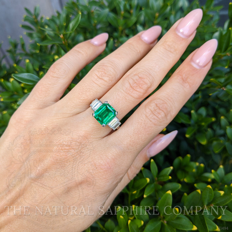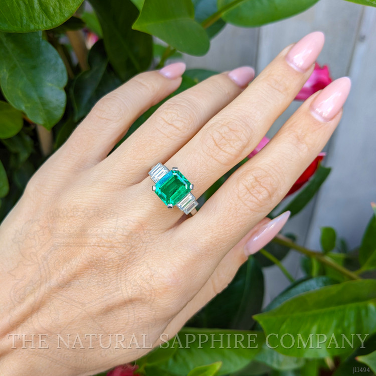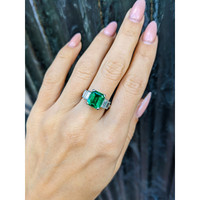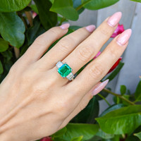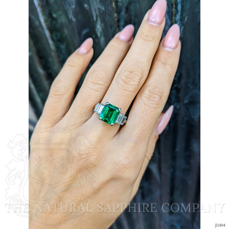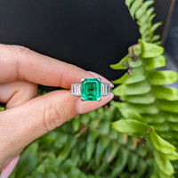 Imagine a moment when the world narrows to two people and a single question, imagine offering something that is unmistakably unique, this ring becomes the emblem of that instant, a compact history of a promise made public and carried privately. The emerald cut is a language of clarity, its long step facets reading like an honest conversation, it suggests transparency and steadfastness rather than flash, it suggests vows kept steadily over years. The vivid green brings to mind renewal and growth, it speaks of shared seasons and the kind of flourishing that comes from steady attention. The baguette diamonds on either side do more than add light, they frame the center as though to say that commitment is supported by thoughtfulness and structure, small but crucial acts that uphold a larger beauty. Worn at the moment of proposal, this ring will pause a life and then continue its narrative, a visible sign that two people chose continuity and care, that they opted for a bond that will be polished and honored rather than neglected. Choosing this ring is an act of refinement, you are not following a trend, you are claiming a lineage of elegance for a future all your own.